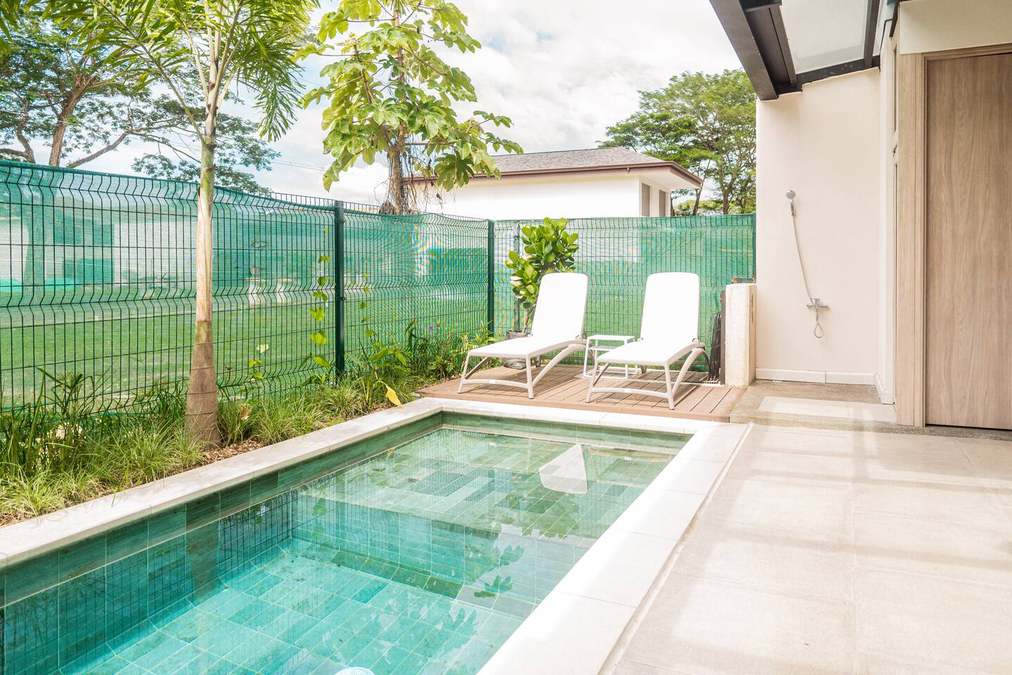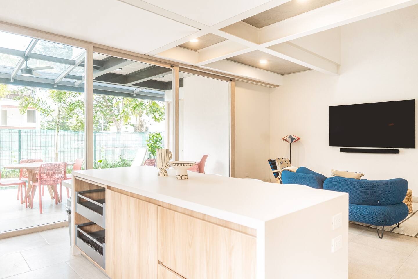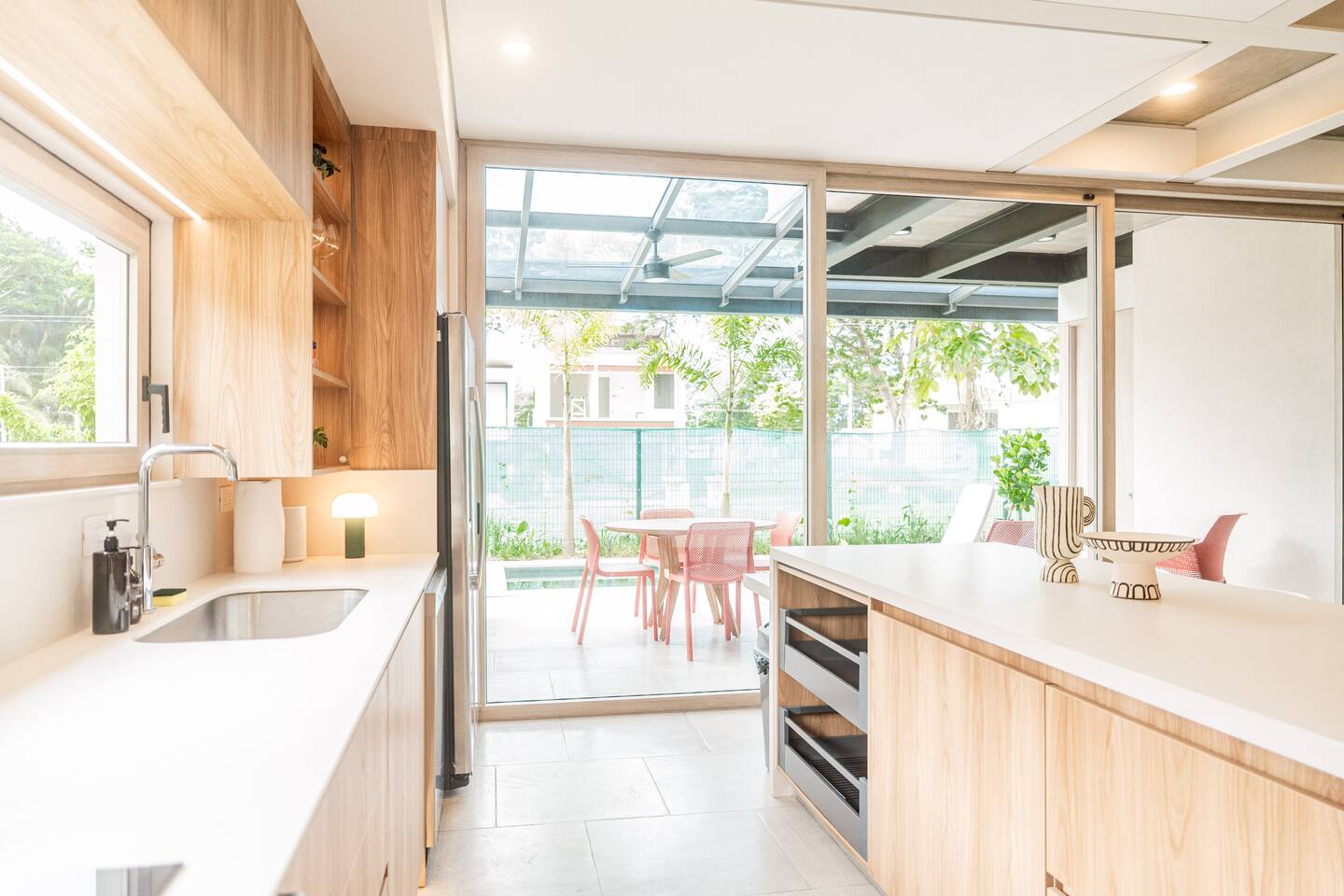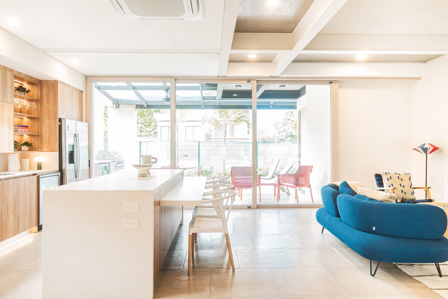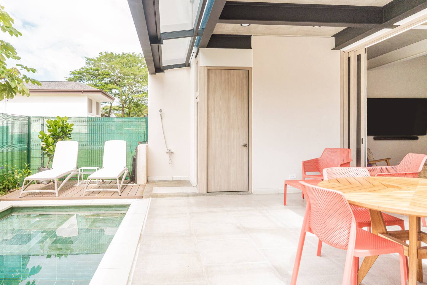 This 2-story, thoughtfully designed 3-bedroom, 3-bath condo blends clean lines with warm, natural finishes: - Master bedroom on main floor with king bed and pool access - Second bedroom with bunk bed (queen + single) and private balcony - Third bedroom with a queen bed - Open kitchen with built-in appliances and a spacious island - Bright living area with sofa bed and modern seating - Workspace with desk and natural light - Private plunge pool and landscaped patio