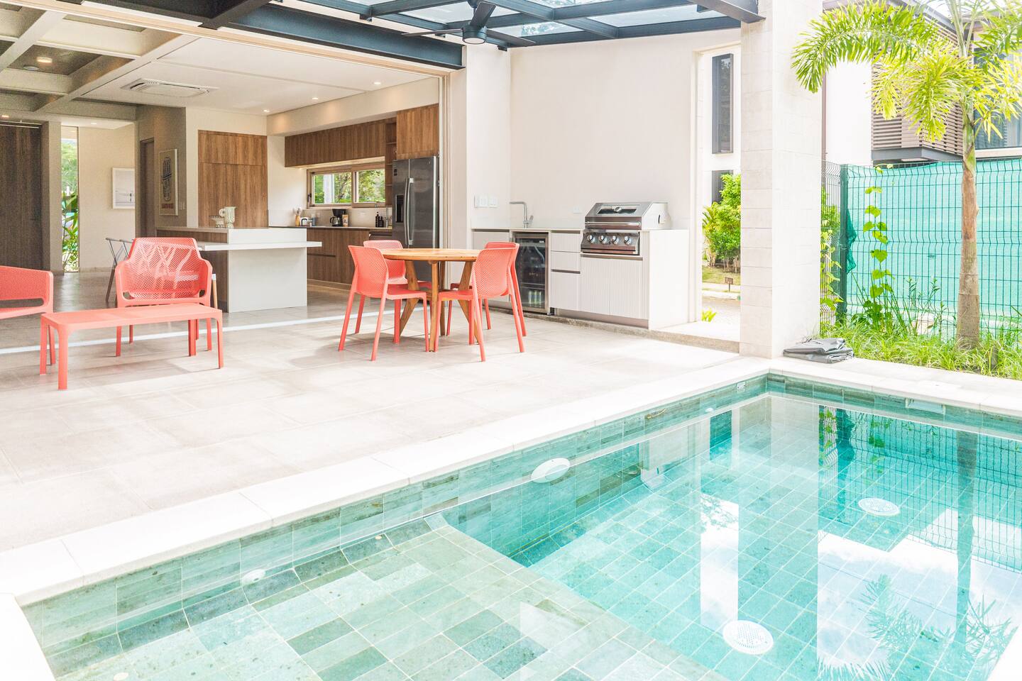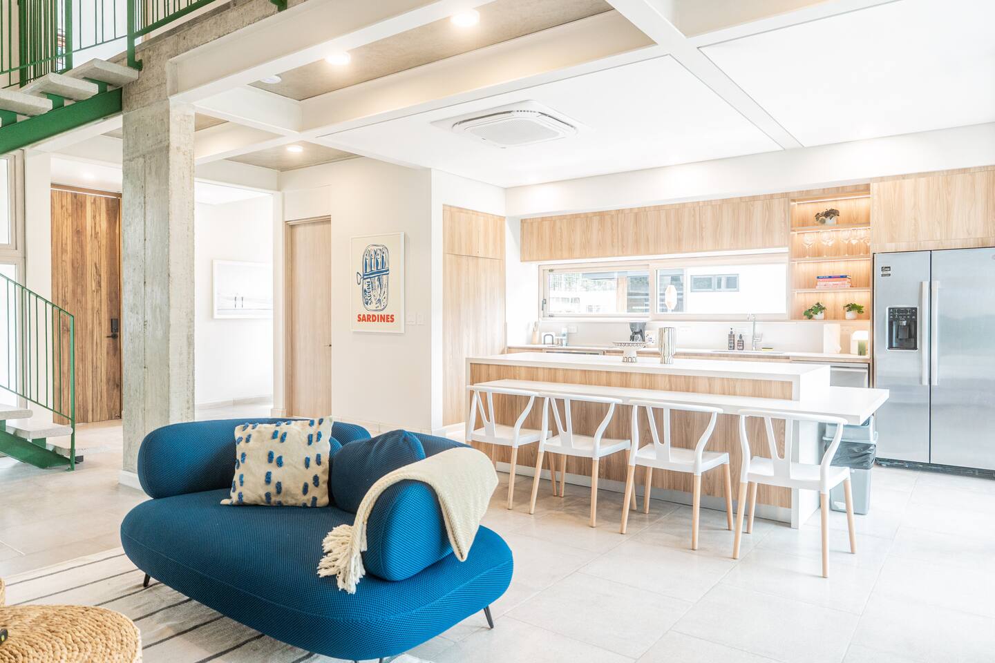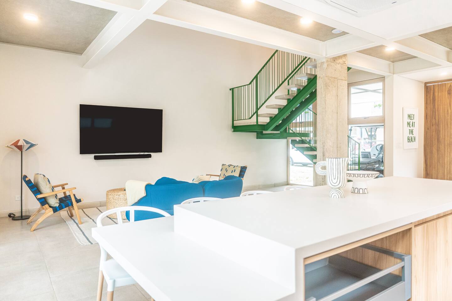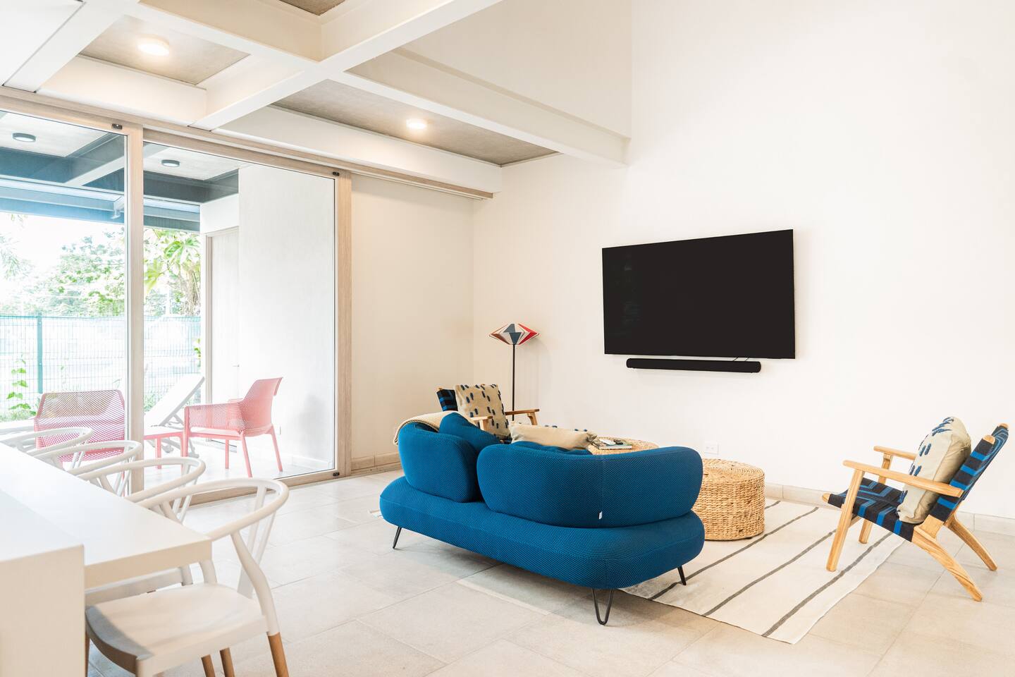 This 2-story, thoughtfully designed 3-bedroom, 3-bath condo blends clean lines with warm, natural finishes: - Master bedroom on main floor with king bed and pool access - Second bedroom with bunk bed (queen + single) and private balcony - Third bedroom with a queen bed - Open kitchen with built-in appliances and a spacious island - Bright living area with sofa bed and modern seating - Workspace with desk and natural light - Private plunge pool and landscaped patio