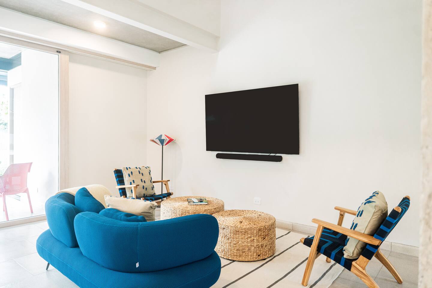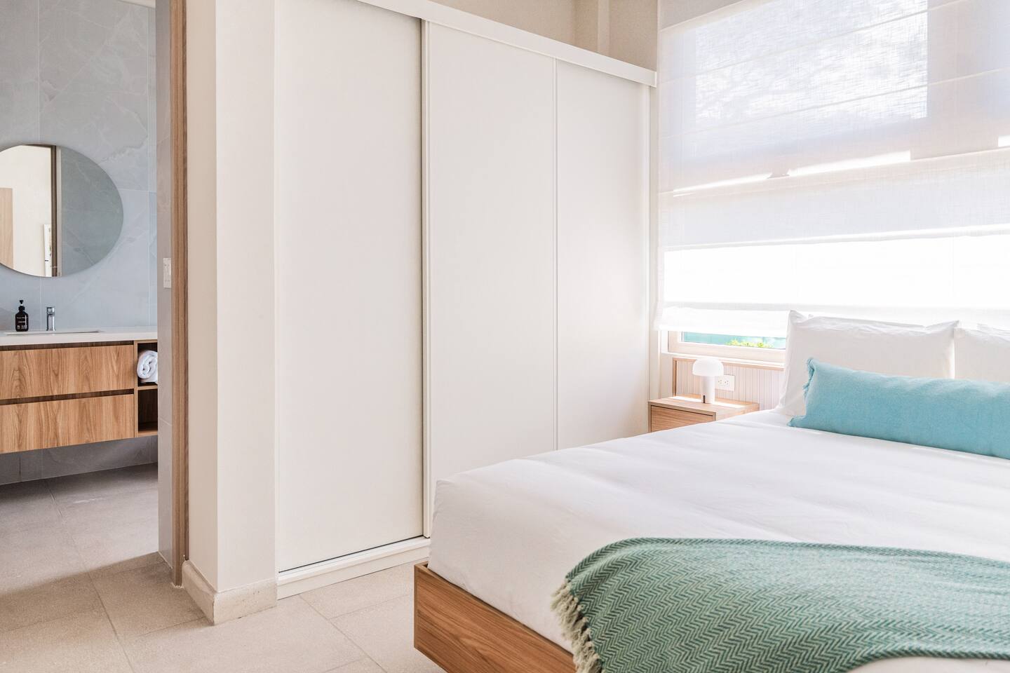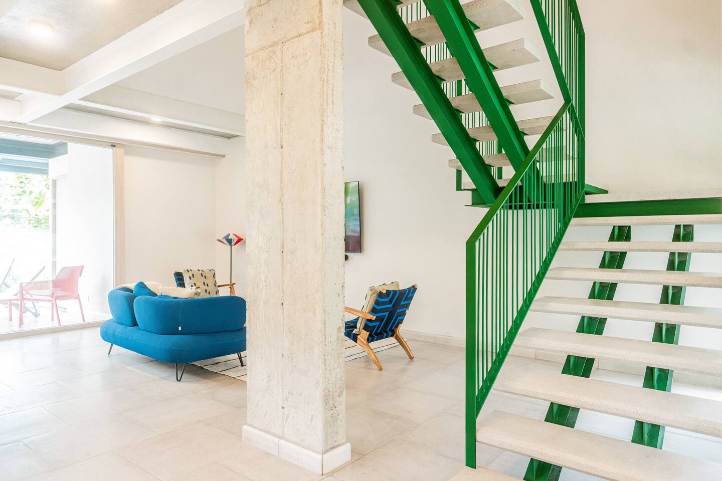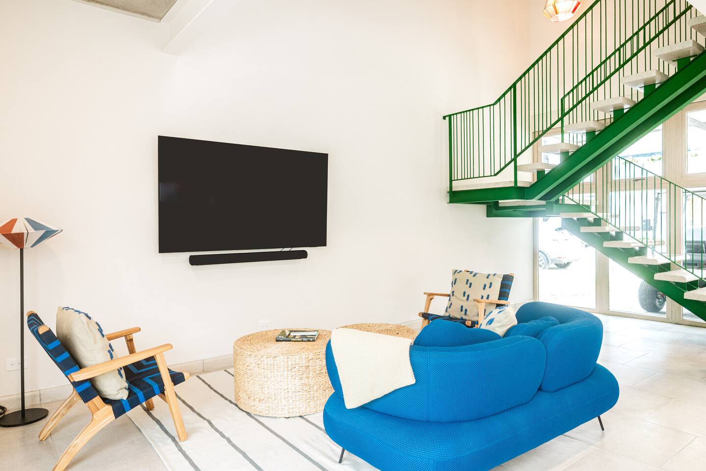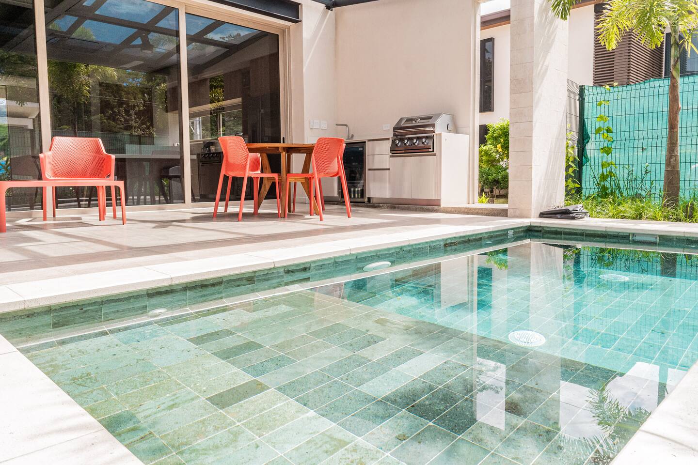 This 2-story, thoughtfully designed 3-bedroom, 3-bath condo blends clean lines with warm, natural finishes: - Master bedroom on main floor with king bed and pool access - Second bedroom with bunk bed (queen + single) and private balcony - Third bedroom with a queen bed - Open kitchen with built-in appliances and a spacious island - Bright living area with sofa bed and modern seating - Workspace with desk and natural light - Private plunge pool and landscaped patio