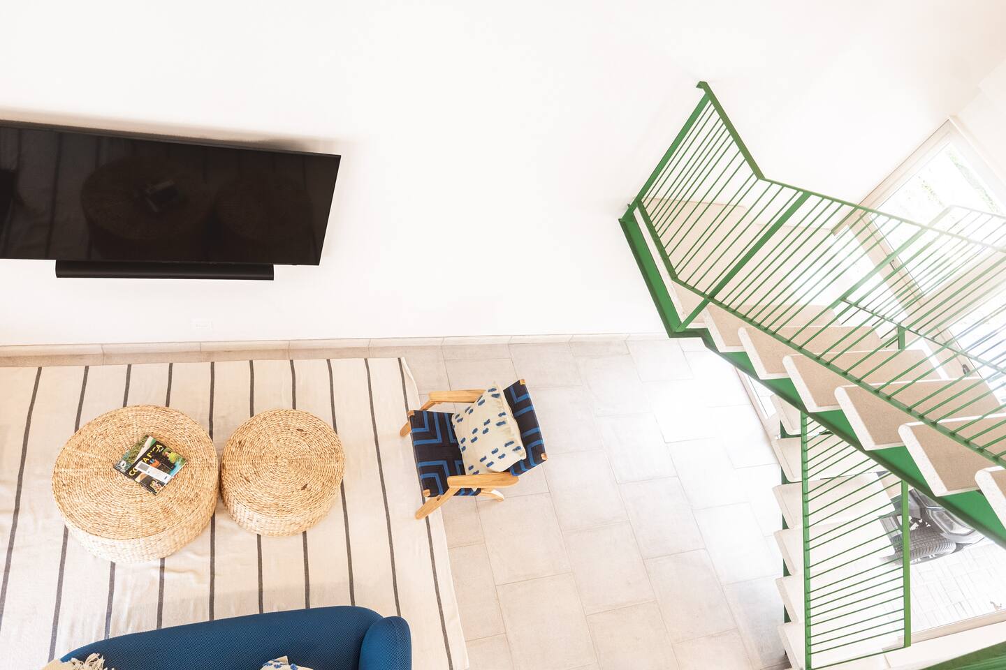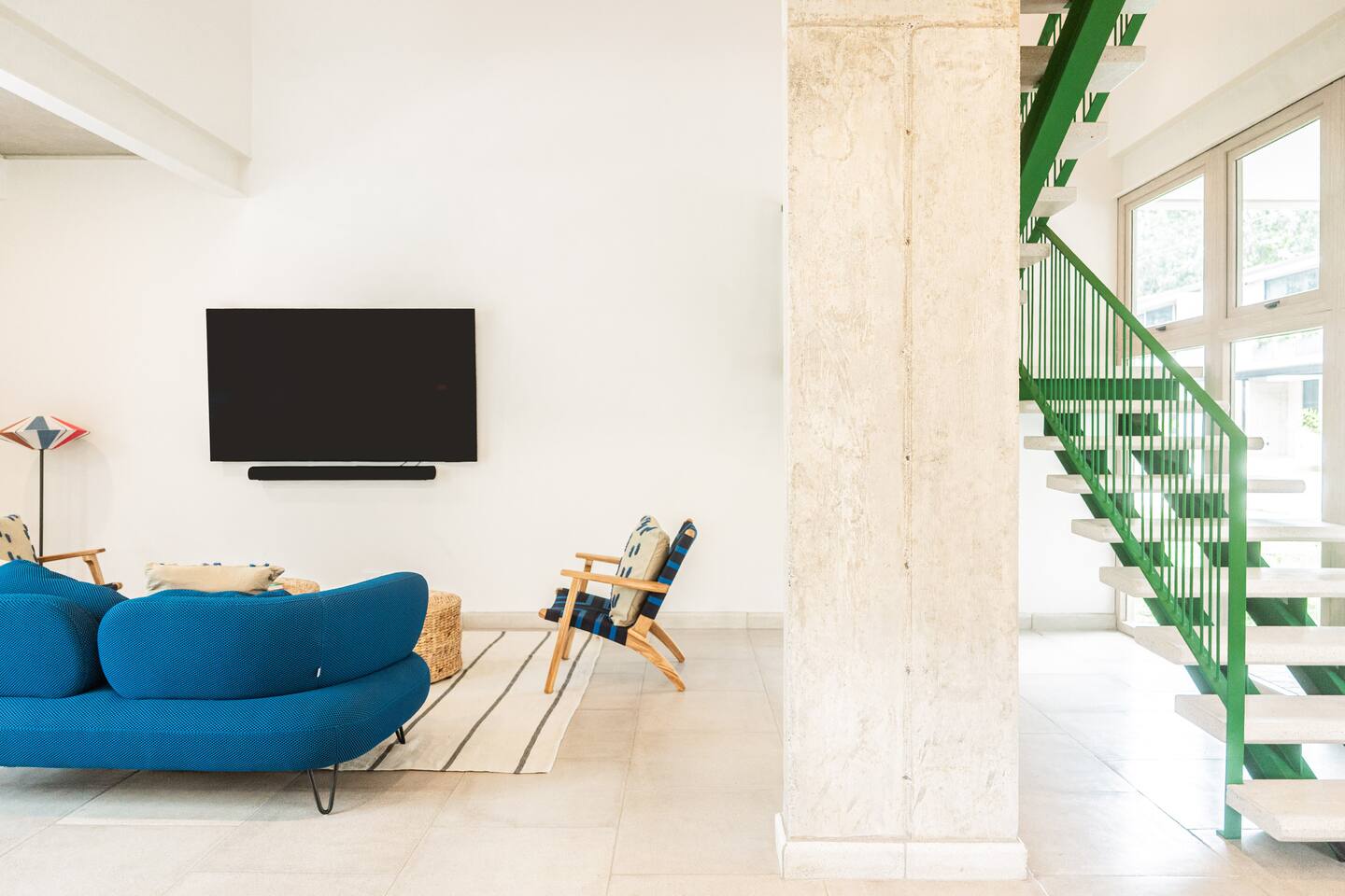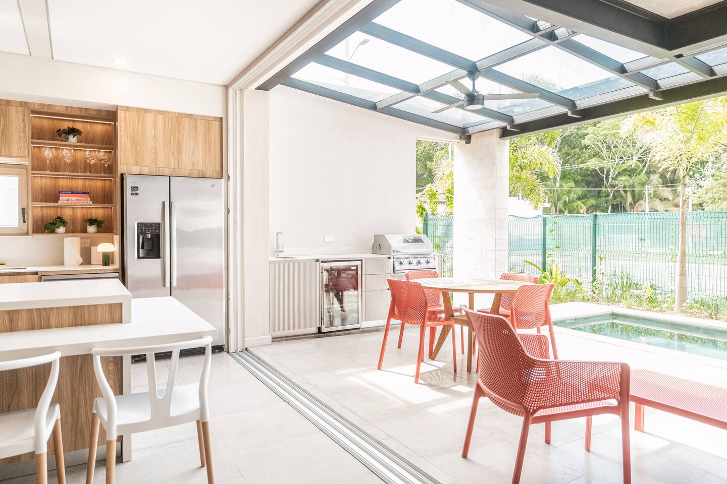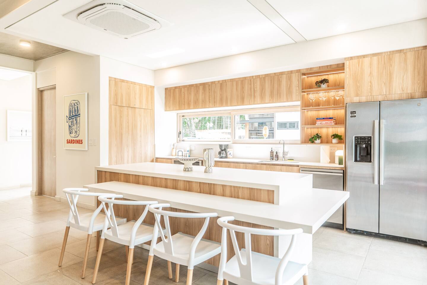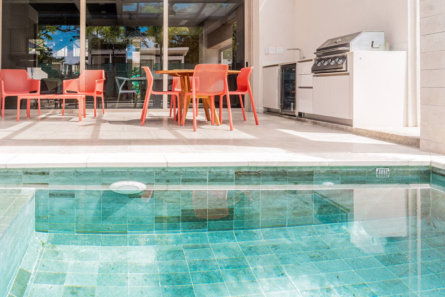 This 2-story, thoughtfully designed 3-bedroom, 3-bath condo blends clean lines with warm, natural finishes: - Master bedroom on main floor with king bed and pool access - Second bedroom with bunk bed (queen + single) and private balcony - Third bedroom with a queen bed - Open kitchen with built-in appliances and a spacious island - Bright living area with sofa bed and modern seating - Workspace with desk and natural light - Private plunge pool and landscaped patio