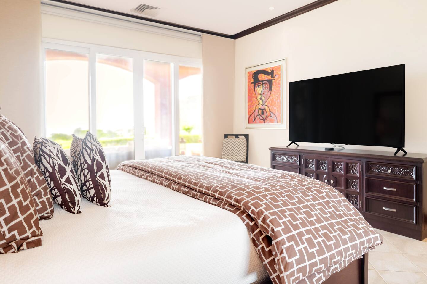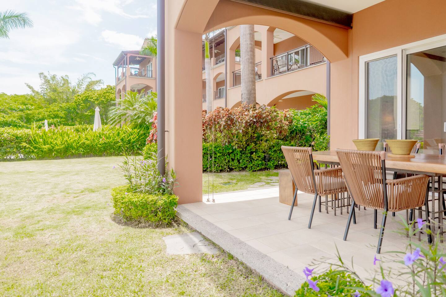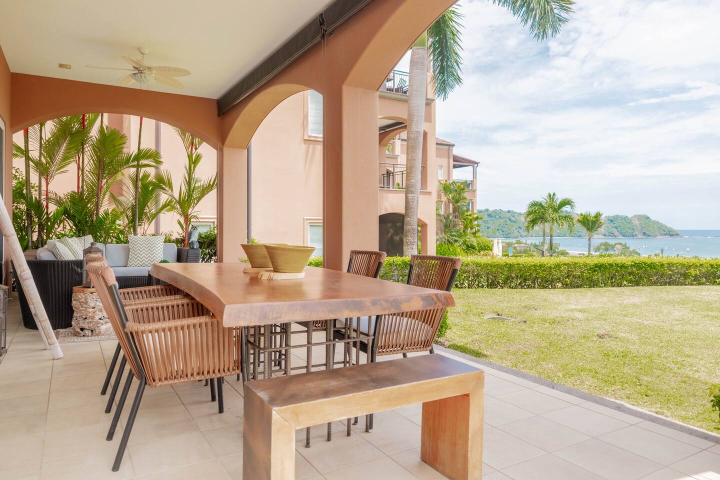 Our spacious 3 bedroom 3 bathroom condo offers ample space and high-end features for a comfortable stay - Master Bedroom: Ocean view, king-sized bed, TV, luxury linens, en-suite bathroom. - Second Bedroom: Queen-sized bed, TV, luxury linens, en-suite bathroom. - Third Bedroom: Two bunk beds, TV, luxury linens, en-suite bathroom. - Living Area: Spacious, luxurious seating, large Smart TV, panoramic ocean views. - Kitchen: Fully equipped with high-end appliances, ice maker, mini fridge, breakfast bar with stools, small bar table with ocean views. - Dining Area: Main dining table and additional bar table with stools, both with ocean views. - Outdoor Space: Large terrace with seating and dining area, direct access to a spacious garden, short walk to the pool with stunning ocean views. -Ground-level apartment