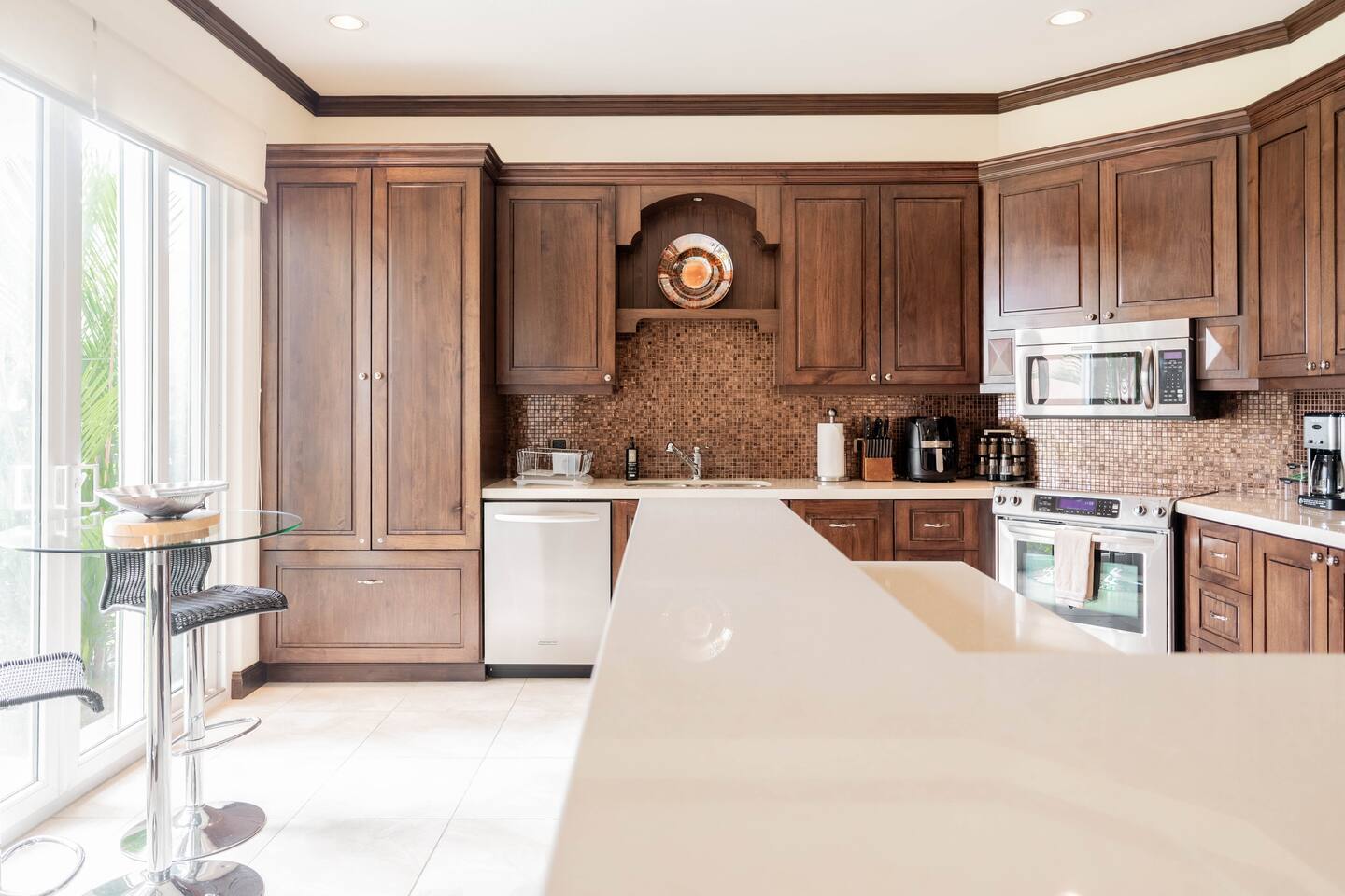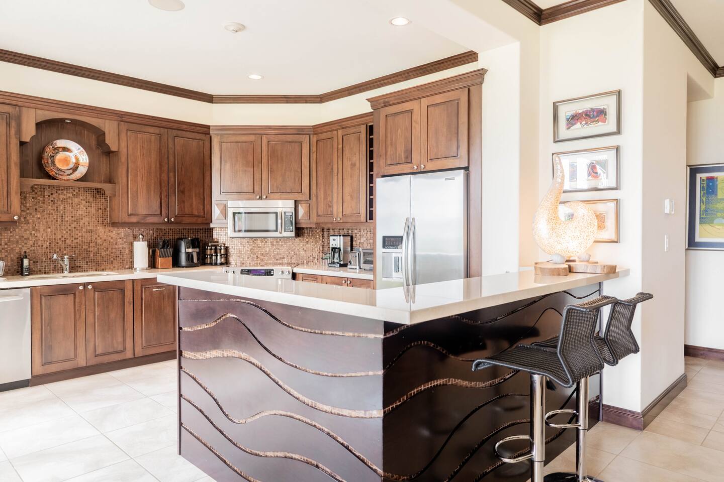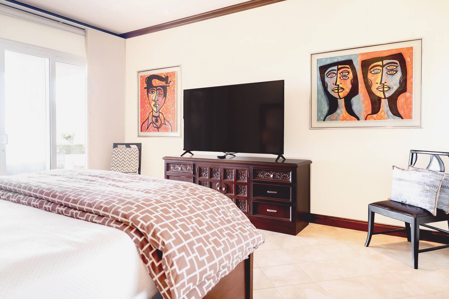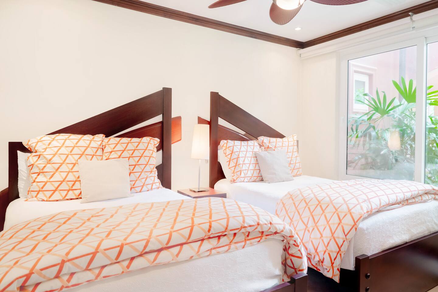 Our spacious 3 bedroom 3 bathroom condo offers ample space and high-end features for a comfortable stay - Master Bedroom: Ocean view, king-sized bed, TV, luxury linens, en-suite bathroom. - Second Bedroom: Queen-sized bed, TV, luxury linens, en-suite bathroom. - Third Bedroom: Two bunk beds, TV, luxury linens, en-suite bathroom. - Living Area: Spacious, luxurious seating, large Smart TV, panoramic ocean views. - Kitchen: Fully equipped with high-end appliances, ice maker, mini fridge, breakfast bar with stools, small bar table with ocean views. - Dining Area: Main dining table and additional bar table with stools, both with ocean views. - Outdoor Space: Large terrace with seating and dining area, direct access to a spacious garden, short walk to the pool with stunning ocean views. -Ground-level apartment