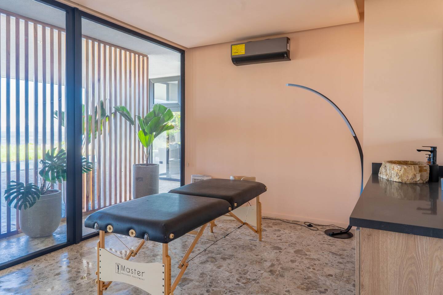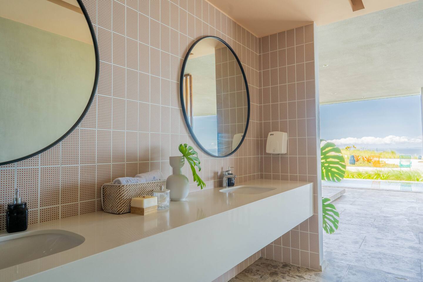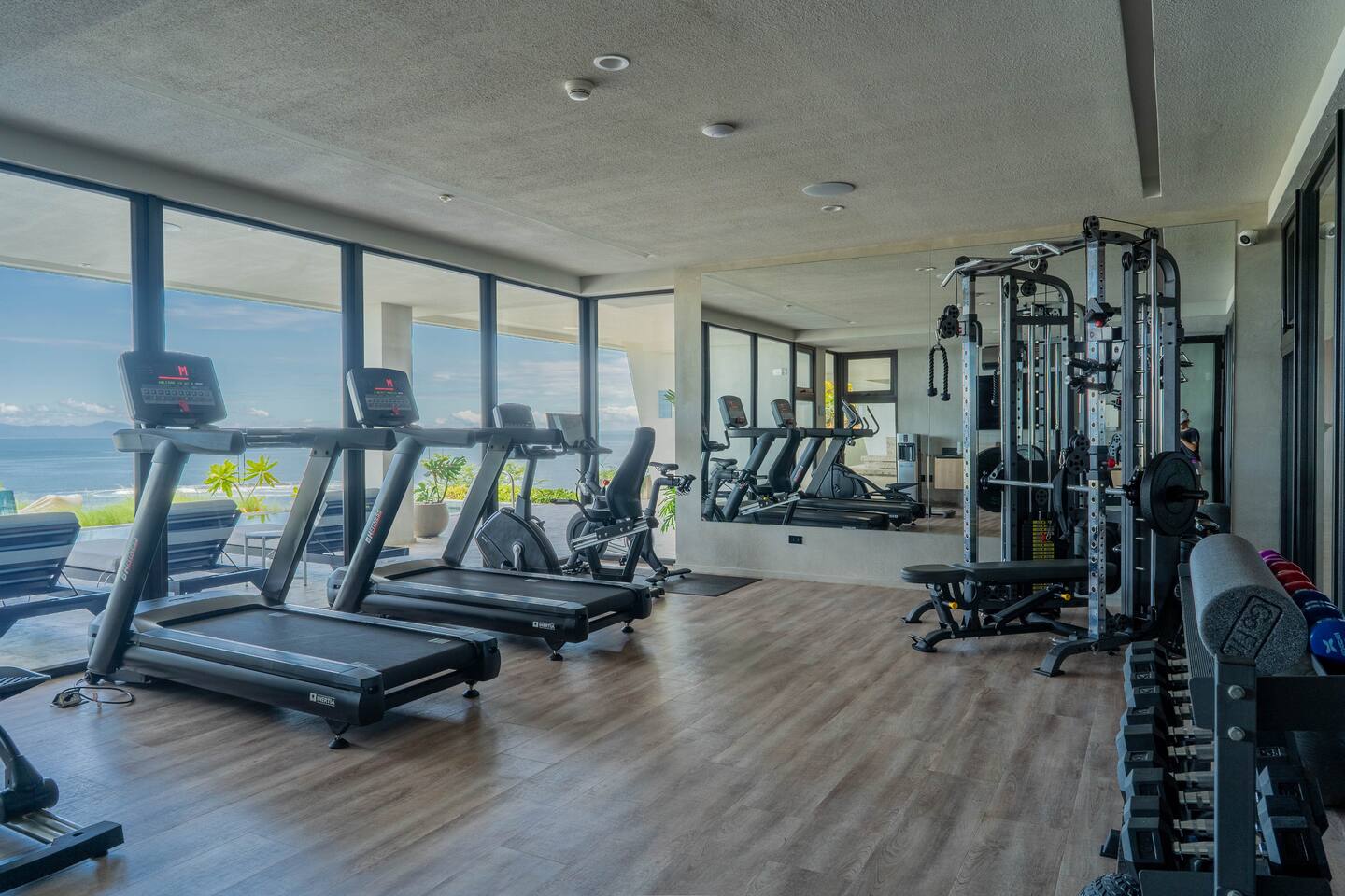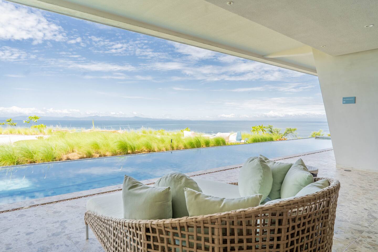 It offers the most exclusive experience the area has to offer with its full suite of hotel like amenities: - Infinity pool with a designer lounge area, poolside kitchen, wine chillers, and ice maker - Wooden wine cellar for sipping a glass of wine or quiet moments of relaxation - Spa area with sauna, massage beds, and bookable massage treatments - Semi-Olympic pool and sunbathing area with cabanas and ocean views - Yoga and meditation decks for wellness-focused guests - Fully equipped gym with ocean views - Entertainment lounge with a pool table, ping pong, bar, and TV - Access to beach