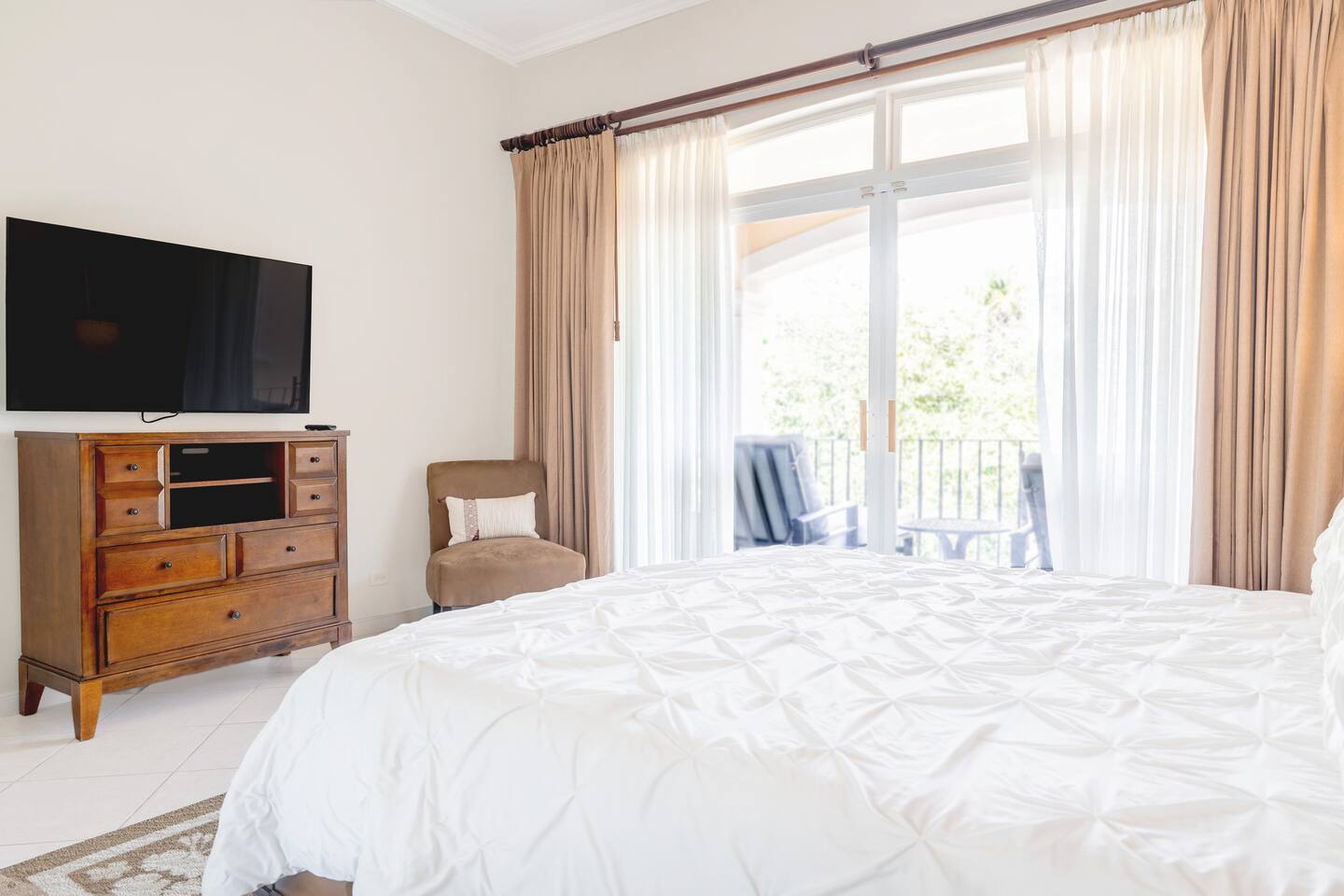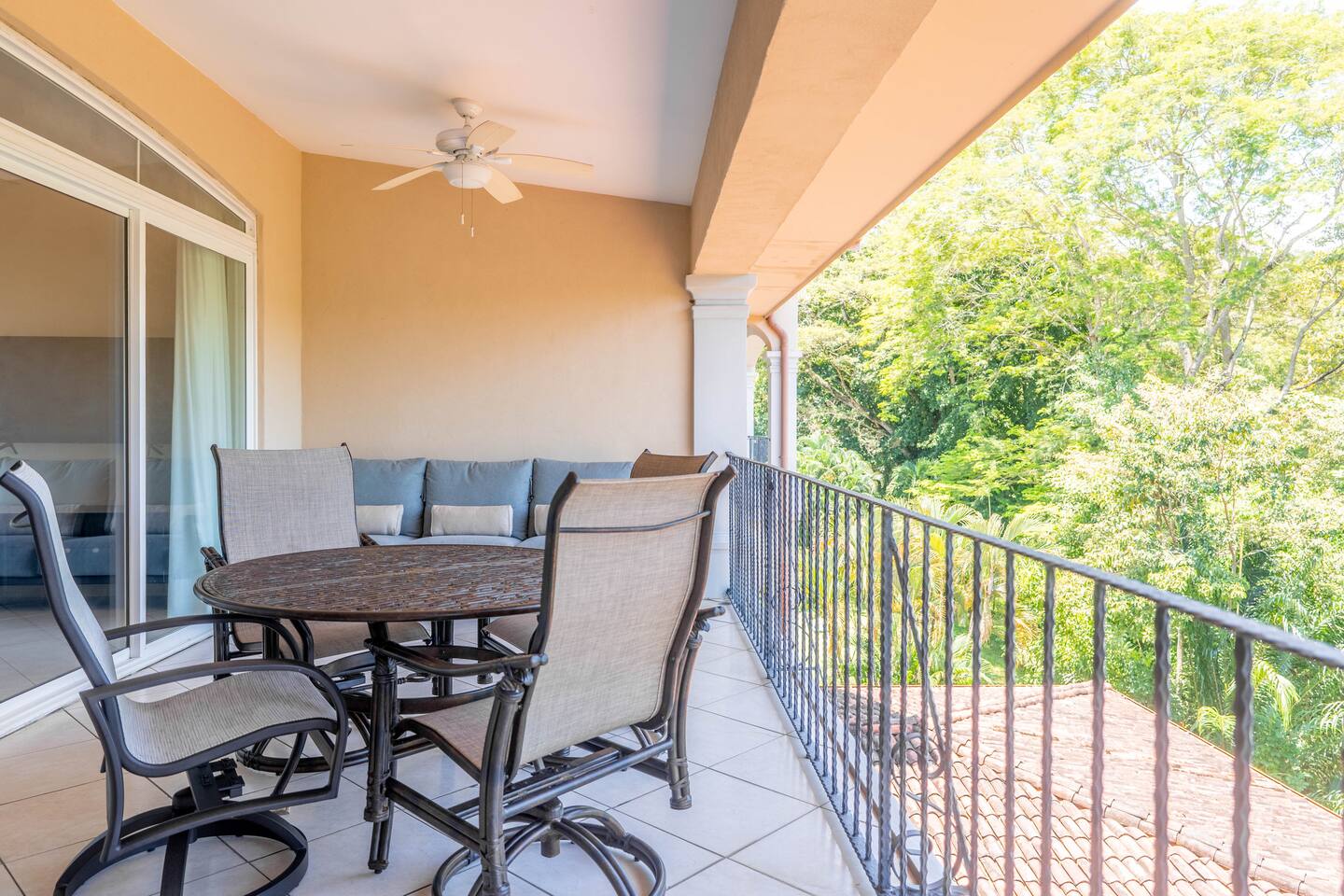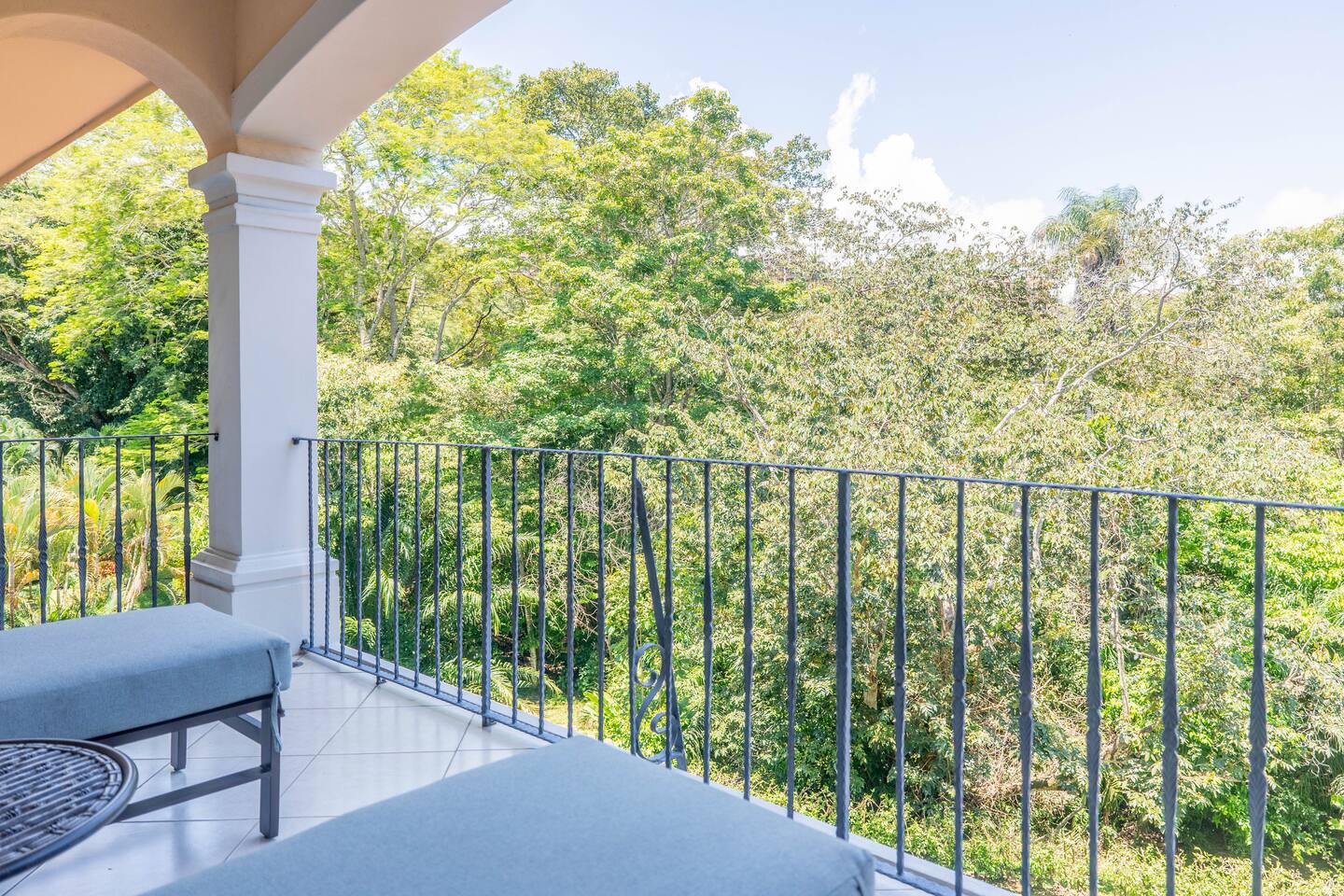Our spacious 3 bedroom 2 bathroom condo is the premium format for Colina, Los Sueños, apartments. It boasts a larger living room and high ceilings. - Master bedroom: King-sized bed, en-suite bathroom and private terrace - Second bedroom: Queen-sized bed - Third bedroom: Two full beds - Open living room with abundant natural light and views of the treetops - Fully equipped kitchen - Balcony offering a peaceful, lush view nestled in the tree-tops