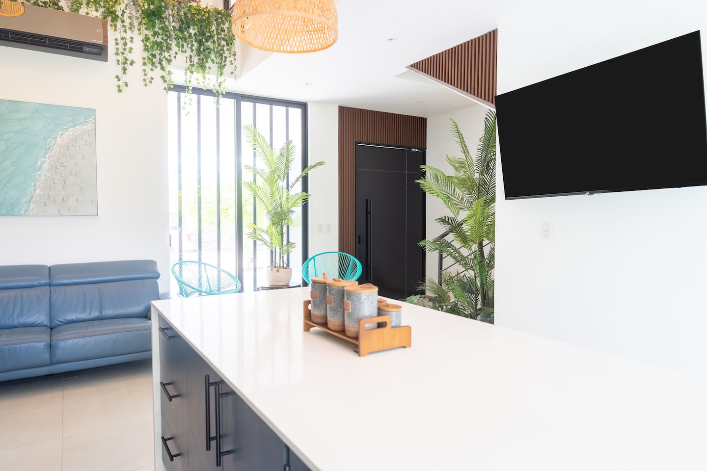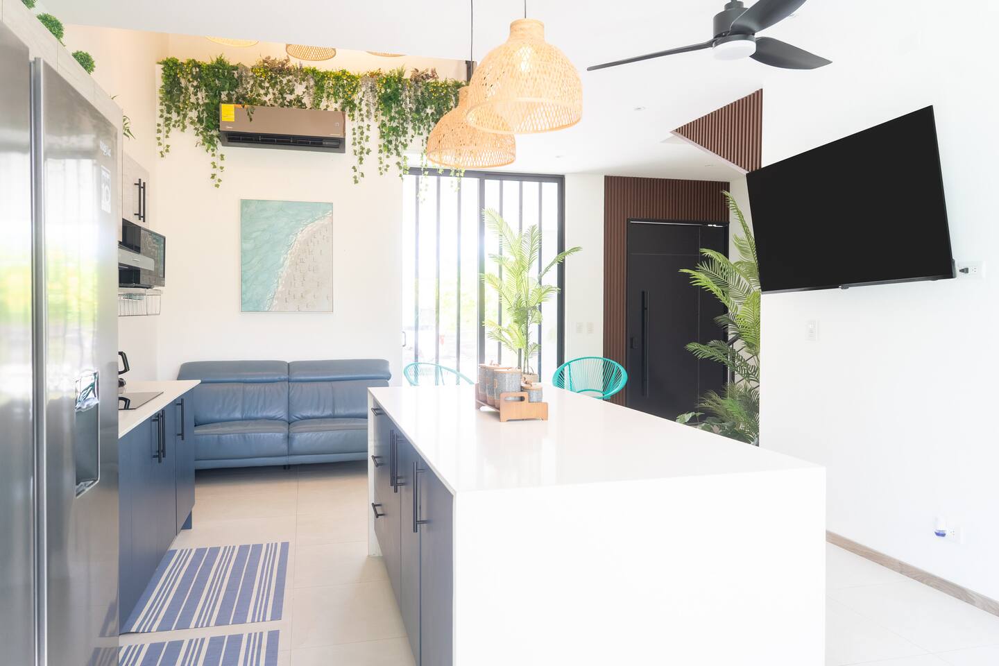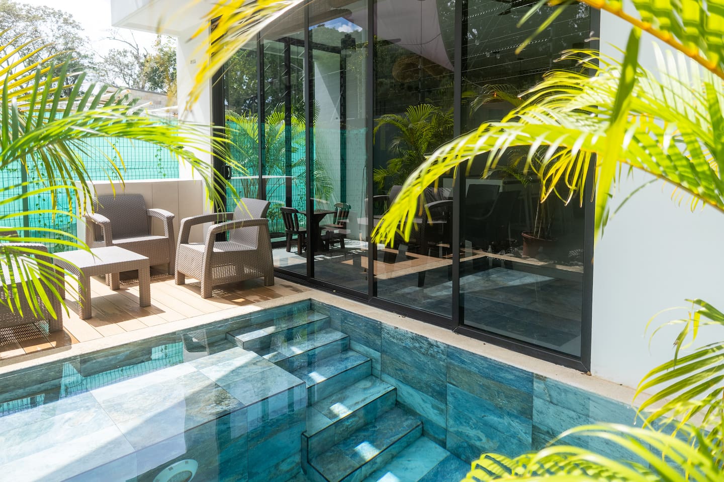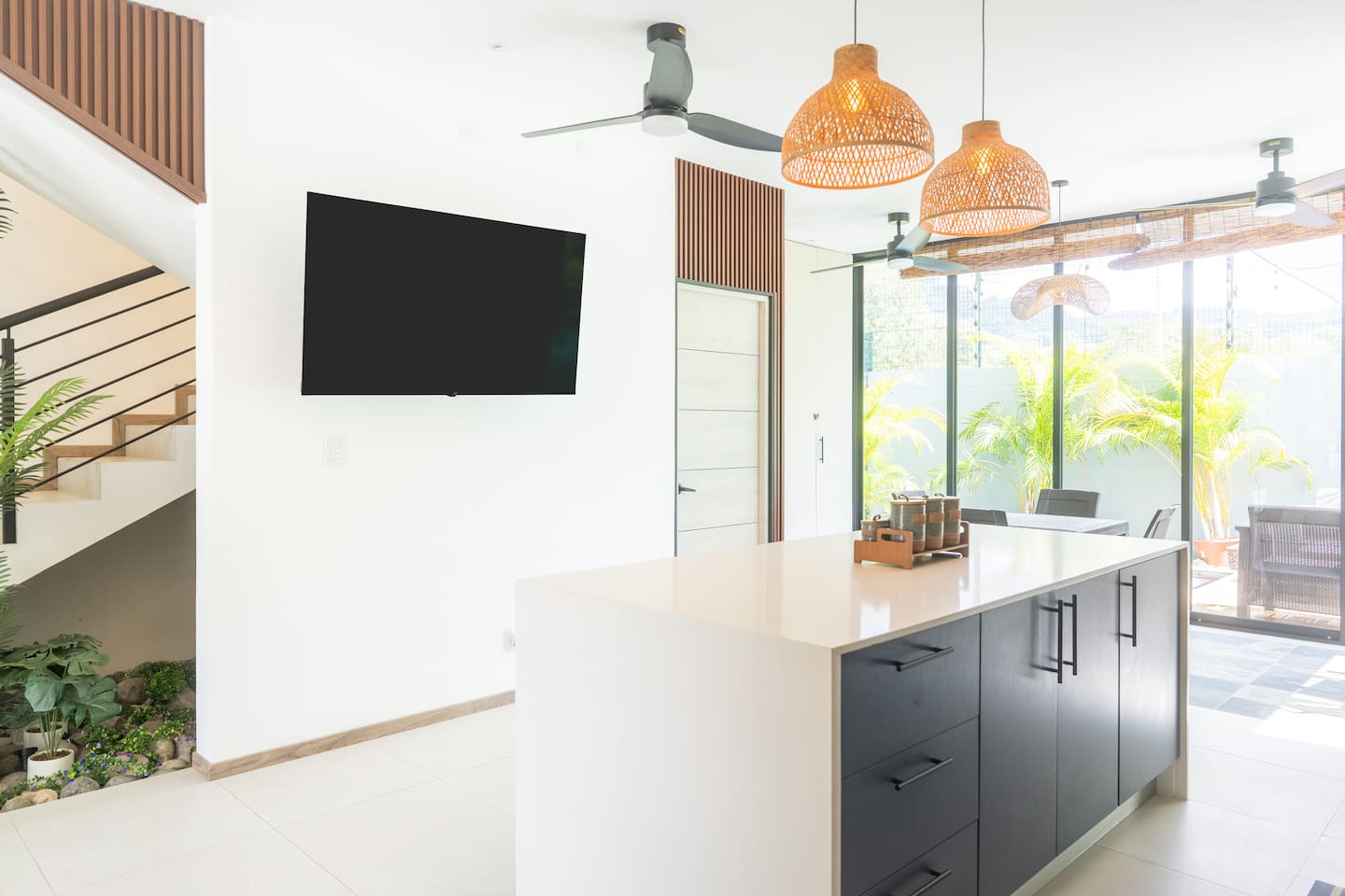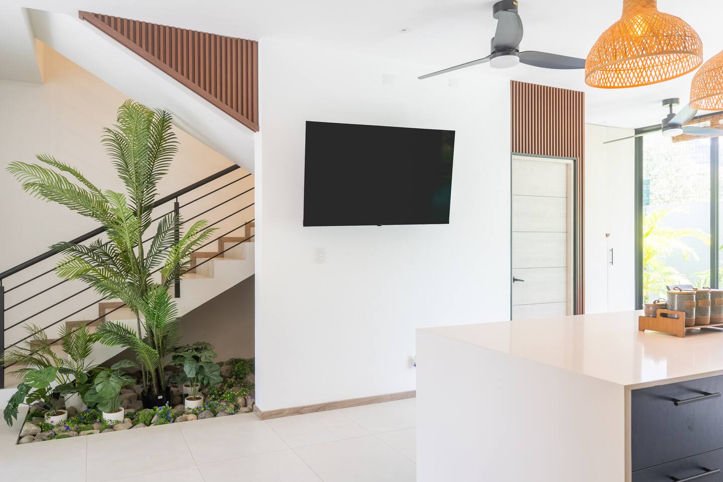 This two-story condo blends contemporary finishes with organic details for a fresh, welcoming feel. • Master bedroom on the second floor with a king bed. • Second bedroom upstairs with a queen bed • Third bedroom upstairs with a queen bed • Bright open-concept living room with comfortable seating • 2.5 bathrooms • Fully equipped modern kitchen with spacious island seating • Private plunge pool with landscaped patio • Thoughtfully designed interiors with natural textures, greenery, and abundant light