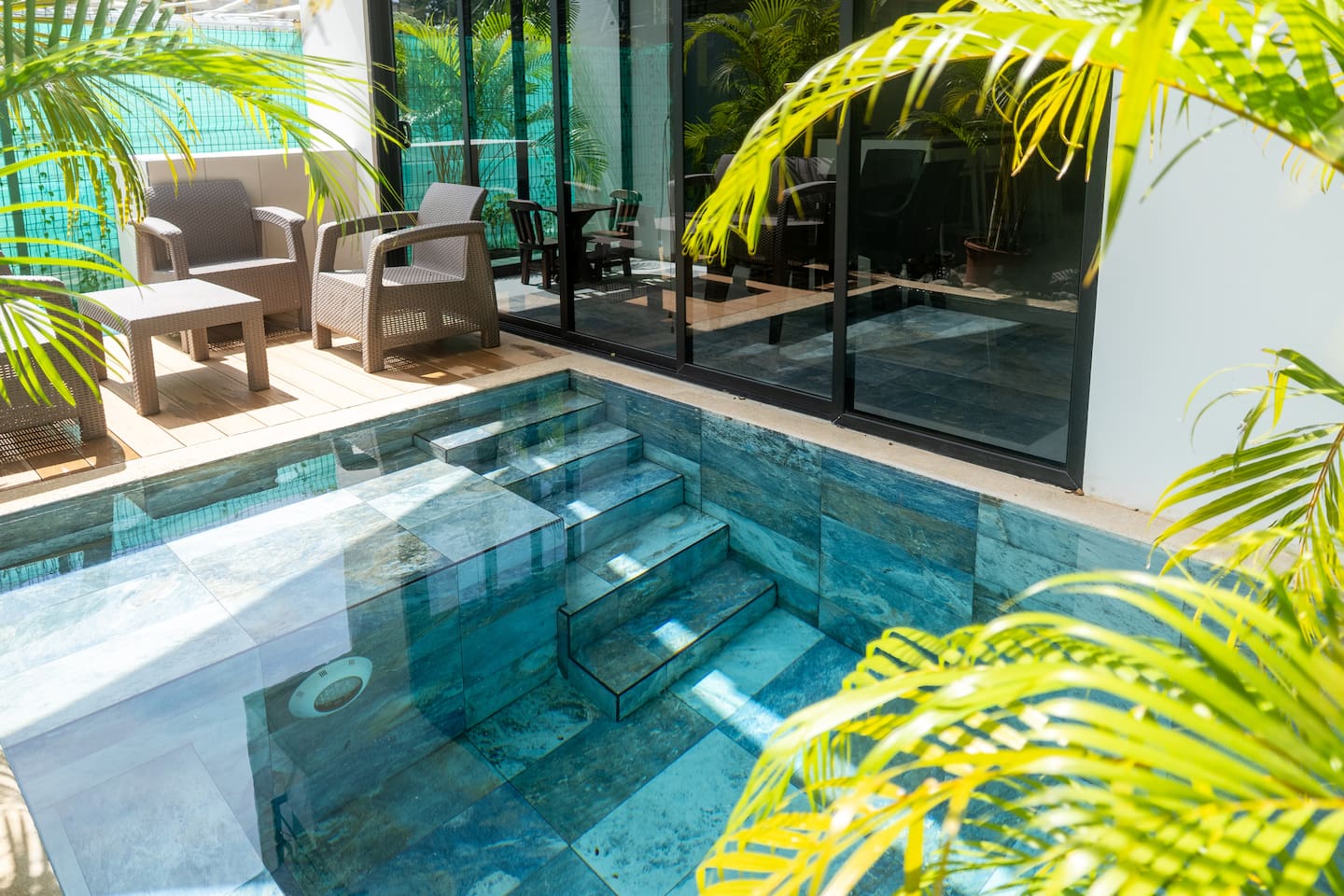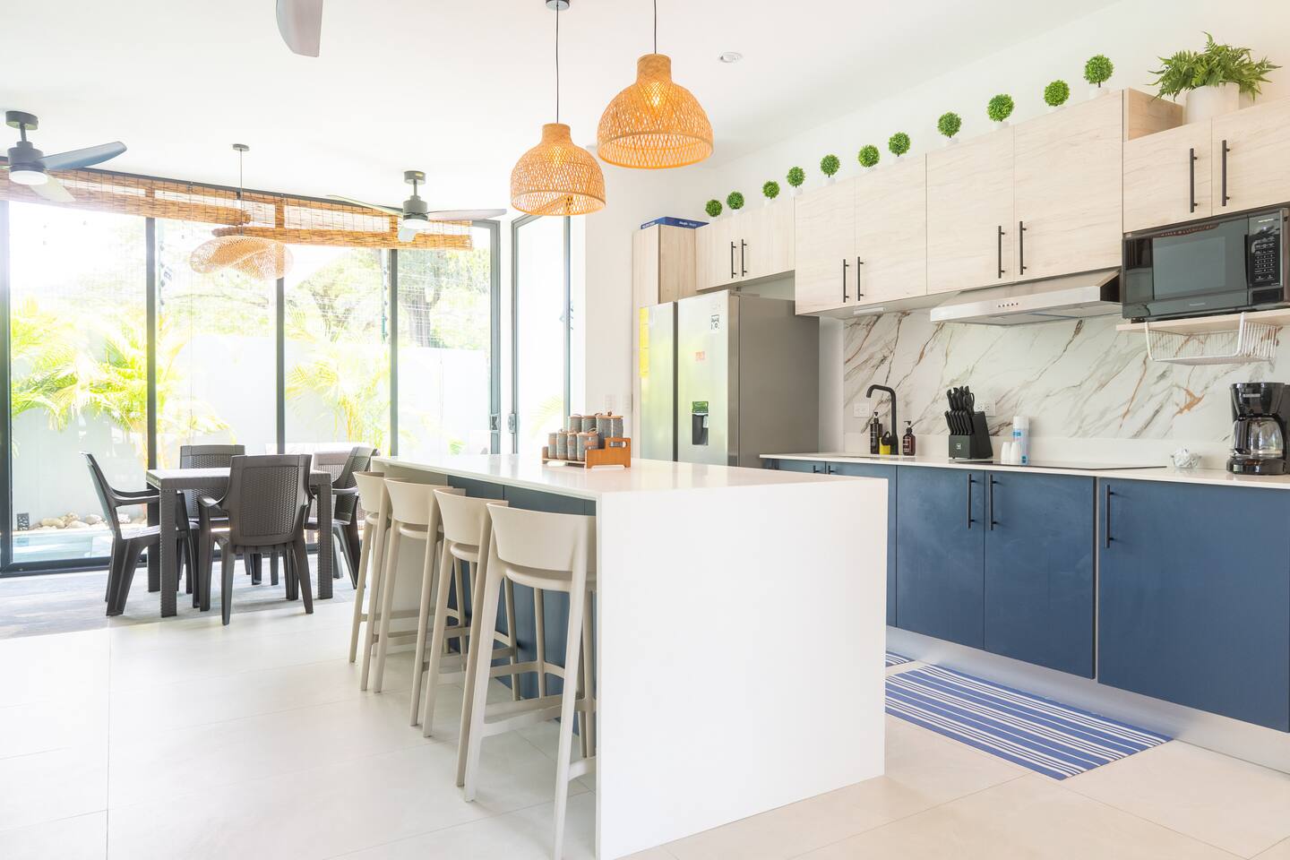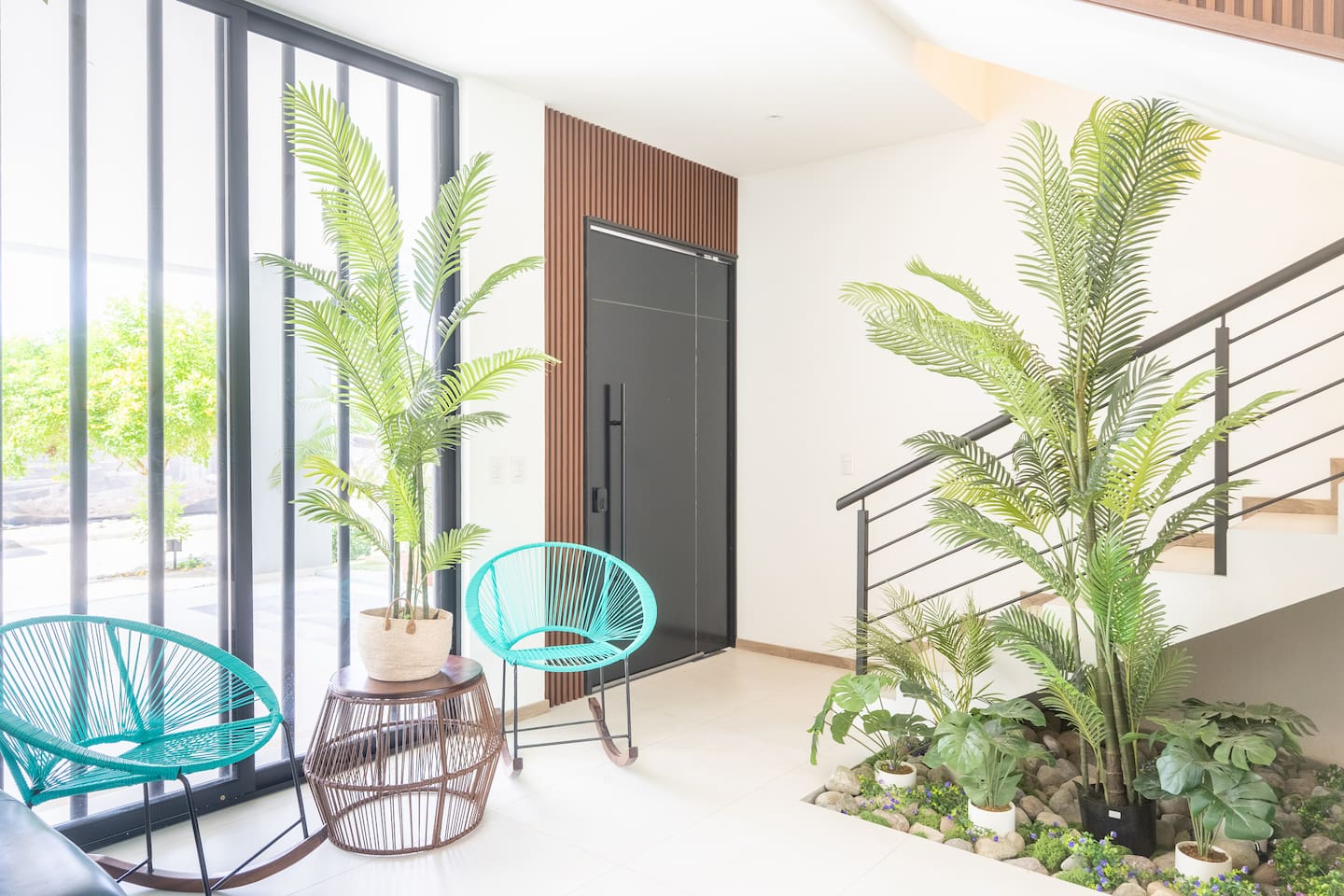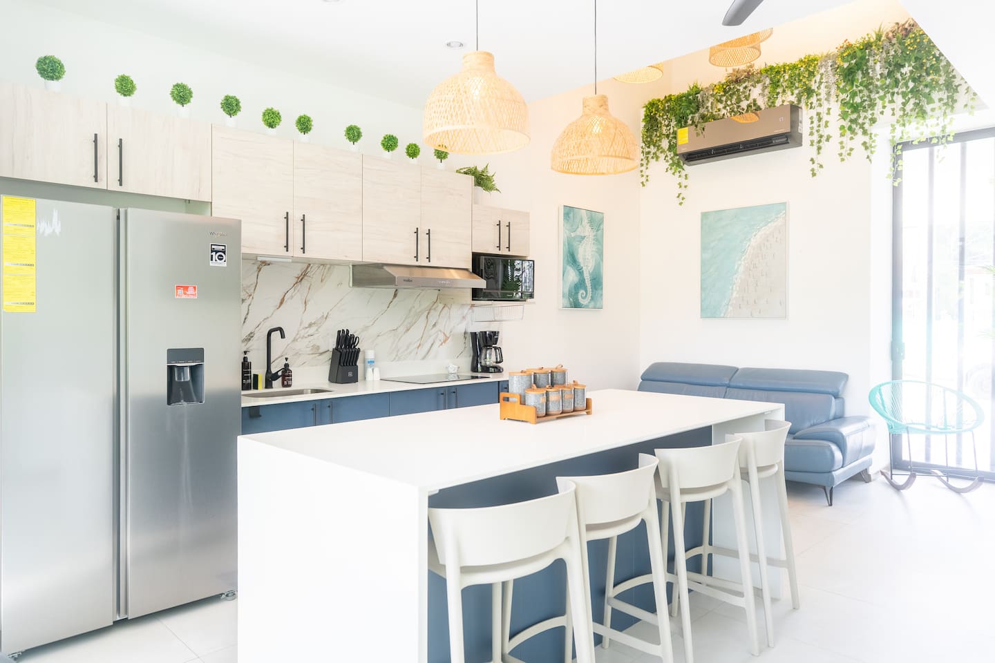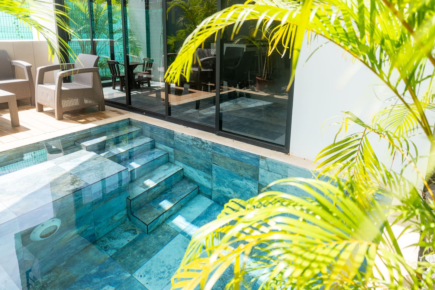 This two-story condo blends contemporary finishes with organic details for a fresh, welcoming feel. • Master bedroom on the second floor with a king bed. • Second bedroom upstairs with a queen bed • Third bedroom upstairs with a queen bed • Bright open-concept living room with comfortable seating • 2.5 bathrooms • Fully equipped modern kitchen with spacious island seating • Private plunge pool with landscaped patio • Thoughtfully designed interiors with natural textures, greenery, and abundant light