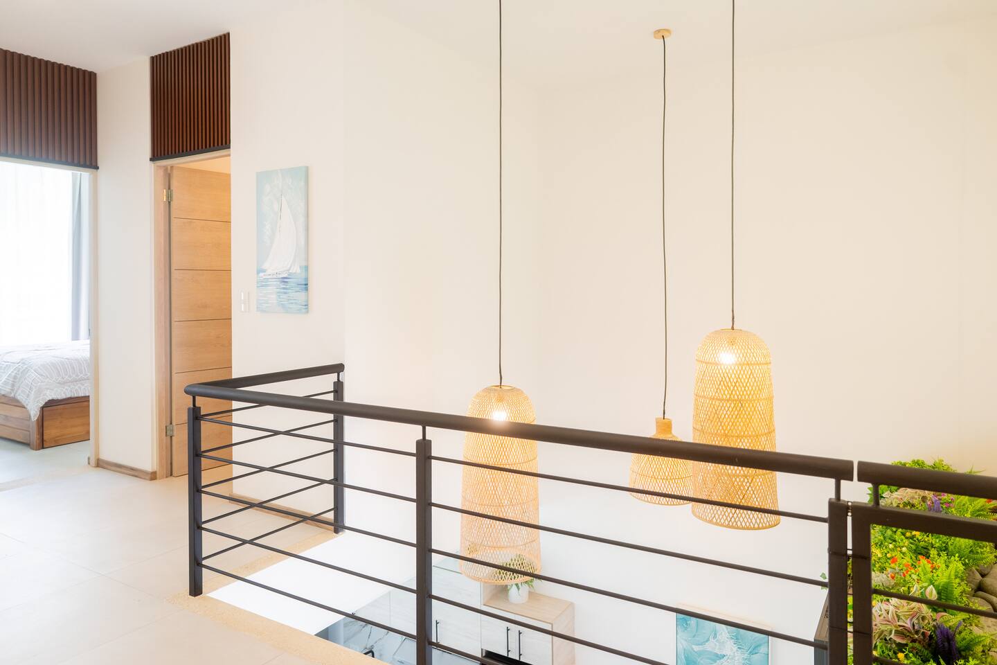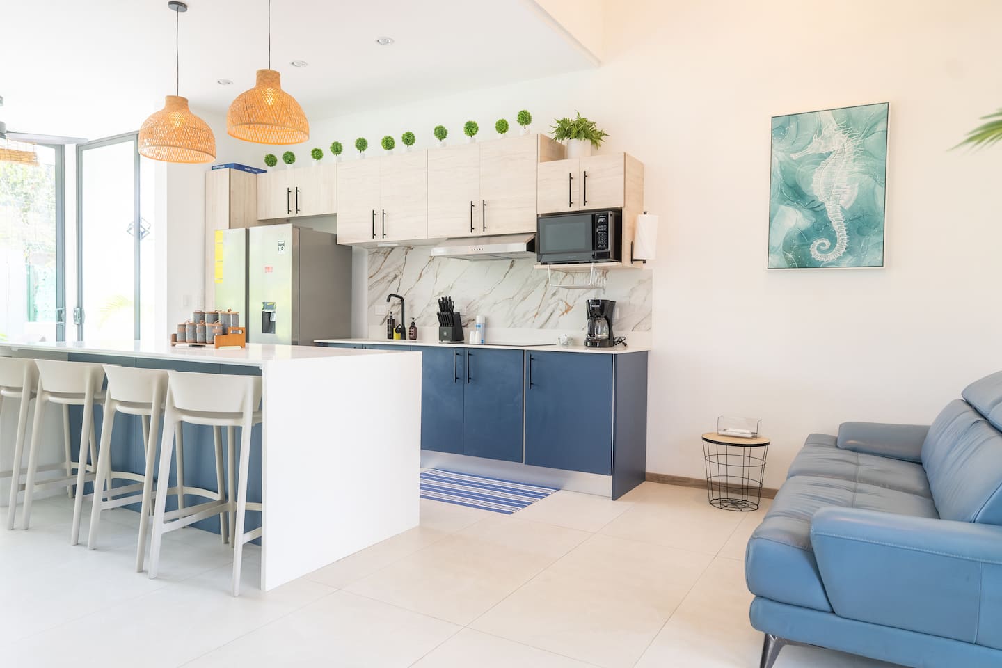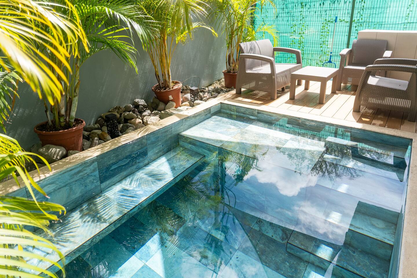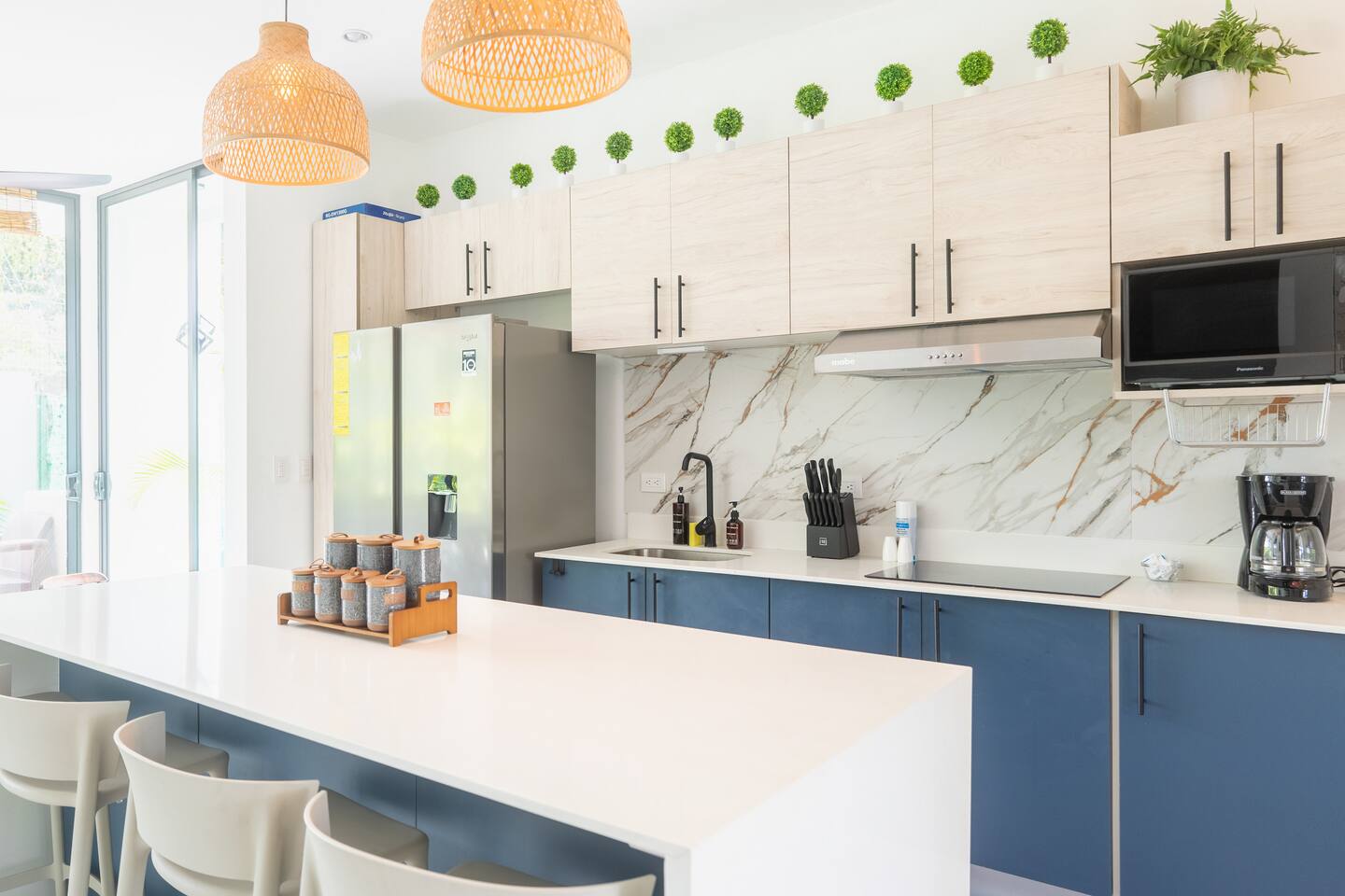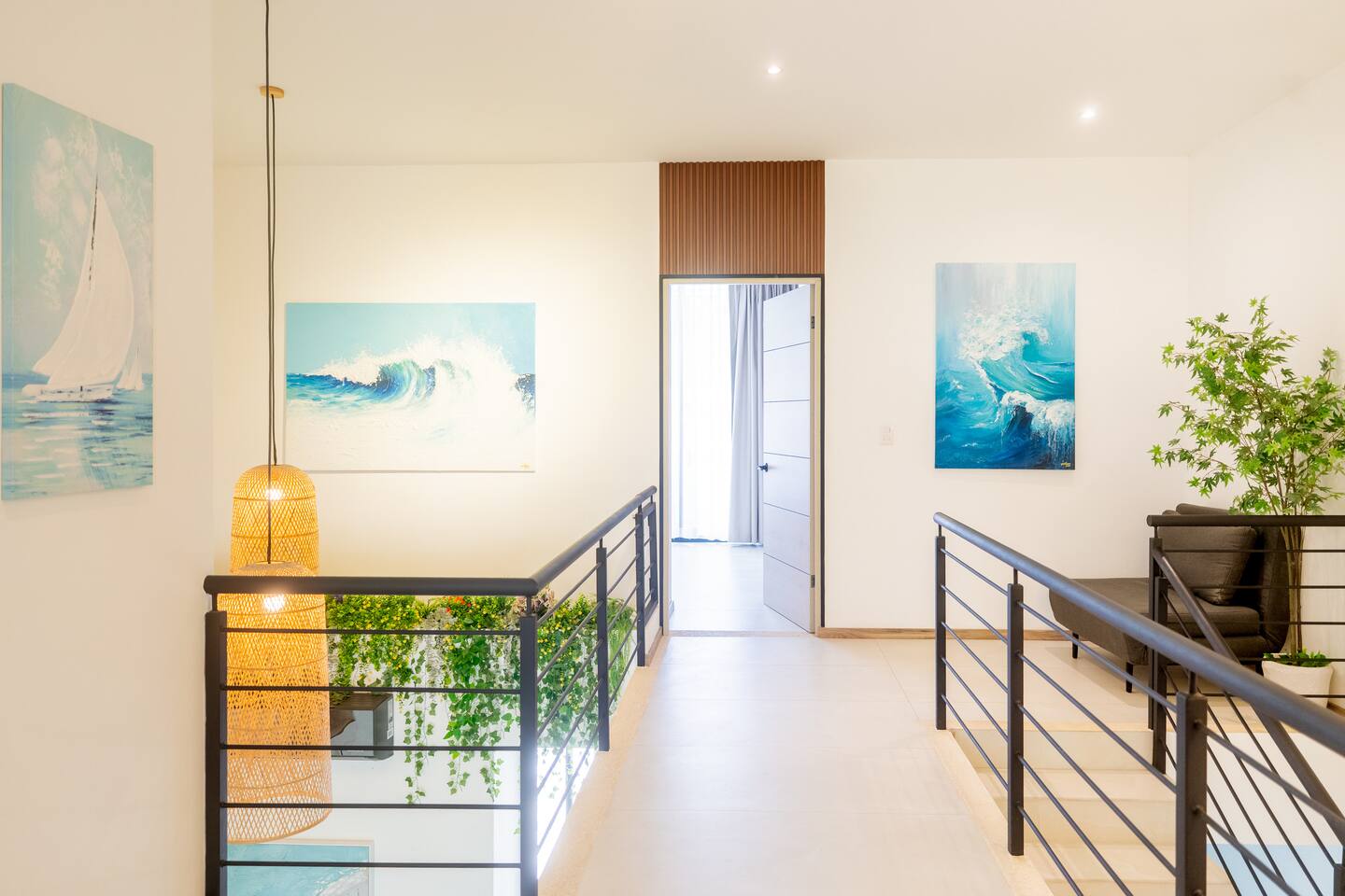 This two-story condo blends contemporary finishes with organic details for a fresh, welcoming feel. • Master bedroom on the second floor with a king bed. • Second bedroom upstairs with a queen bed • Third bedroom upstairs with a queen bed • Bright open-concept living room with comfortable seating • 2.5 bathrooms • Fully equipped modern kitchen with spacious island seating • Private plunge pool with landscaped patio • Thoughtfully designed interiors with natural textures, greenery, and abundant light
