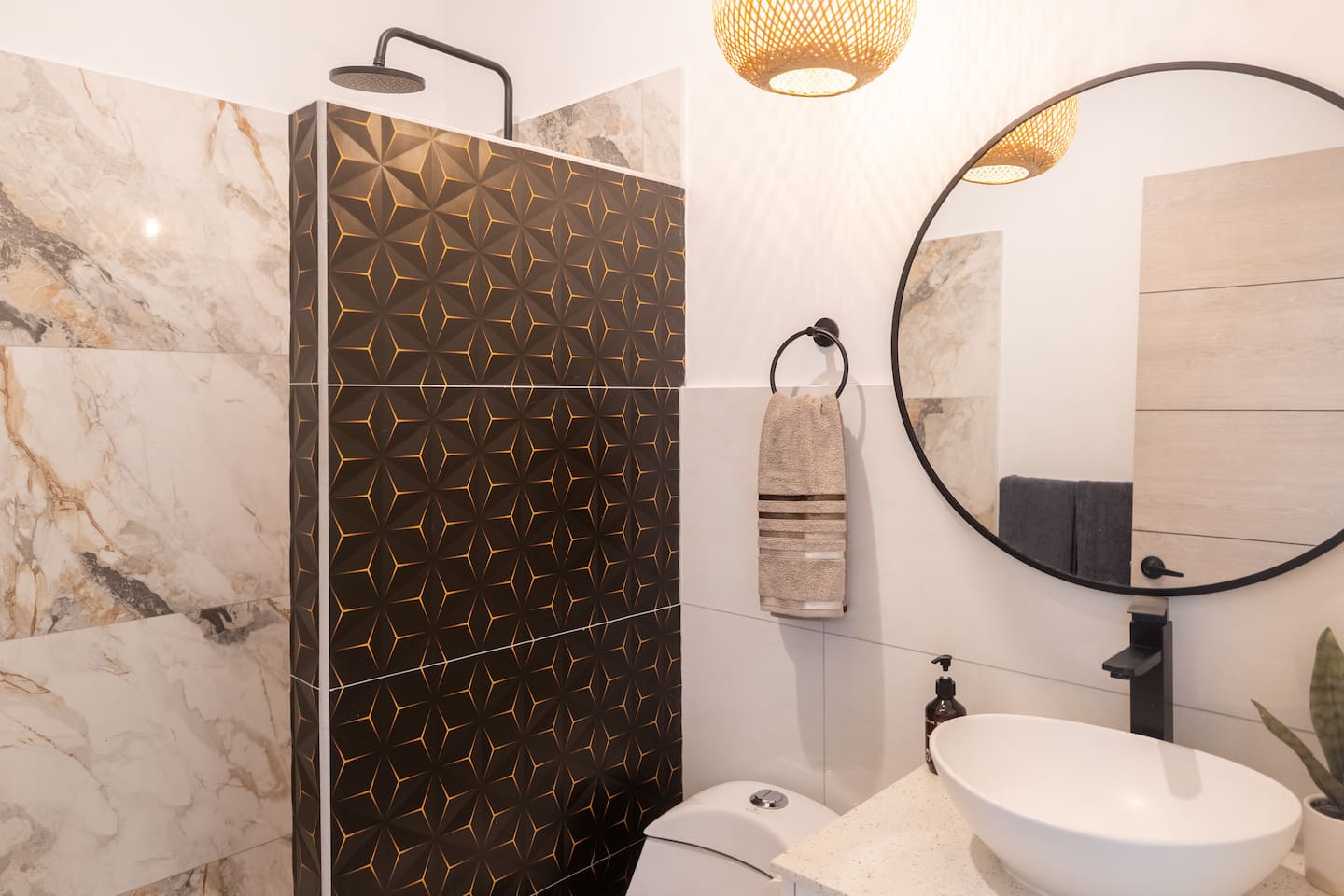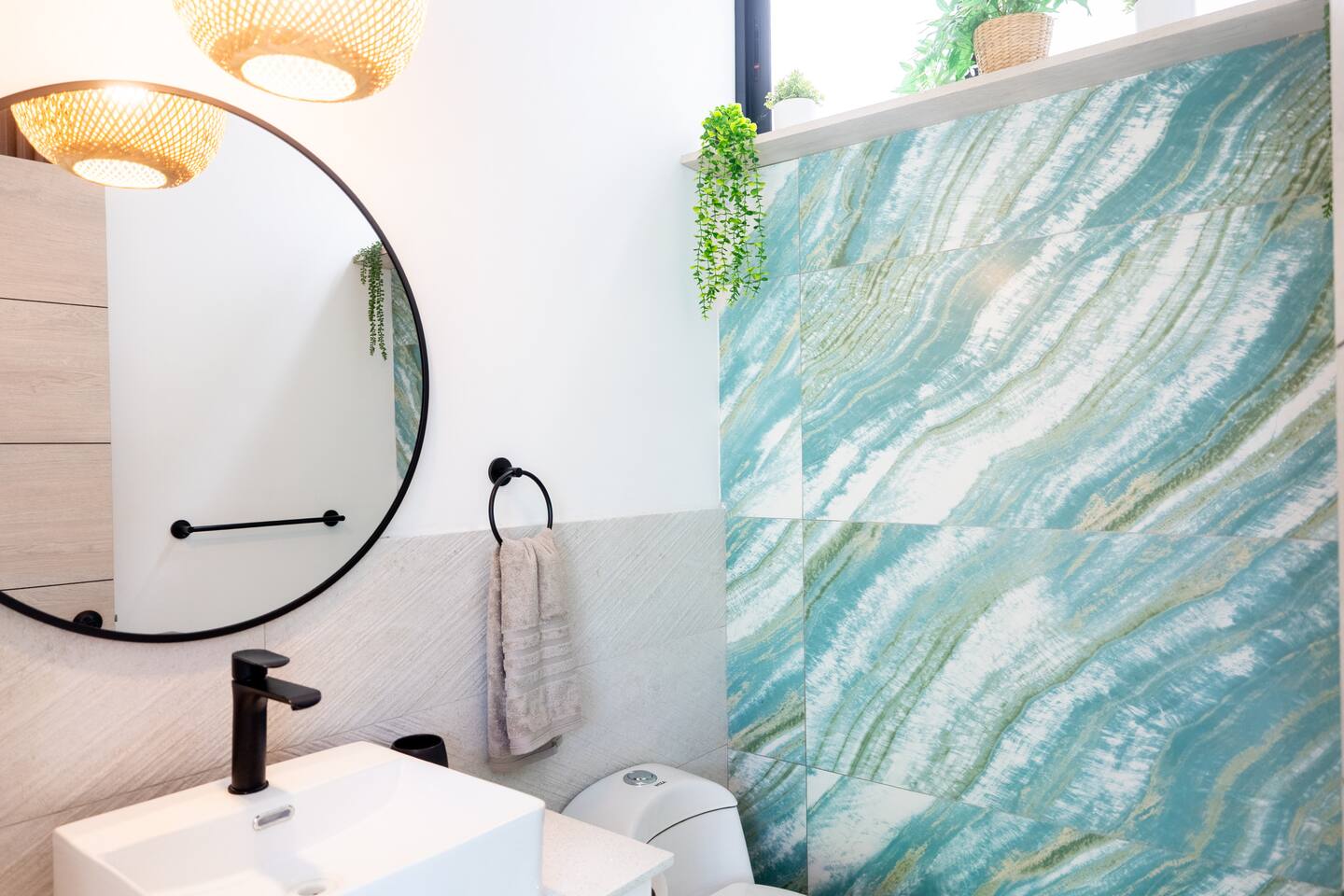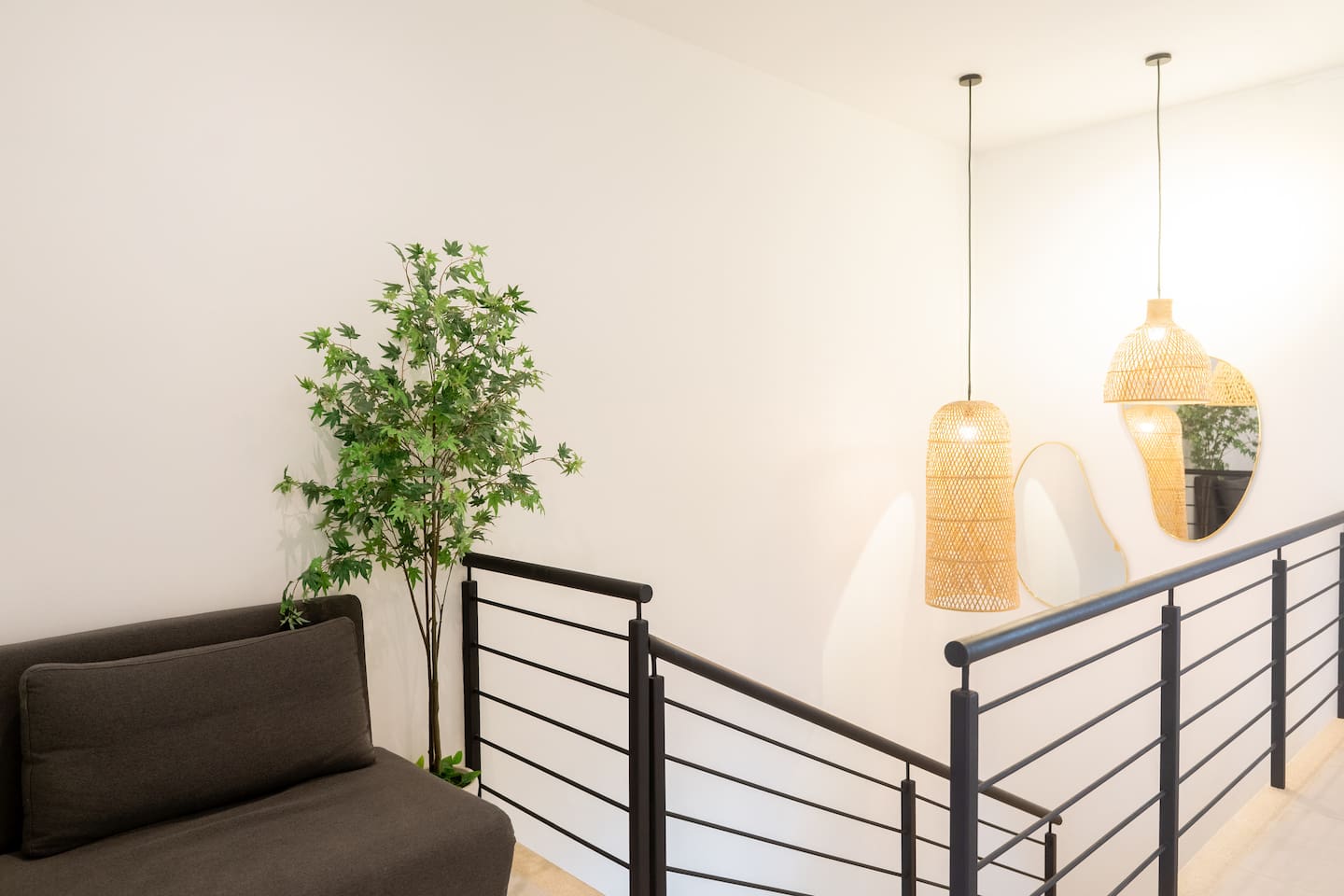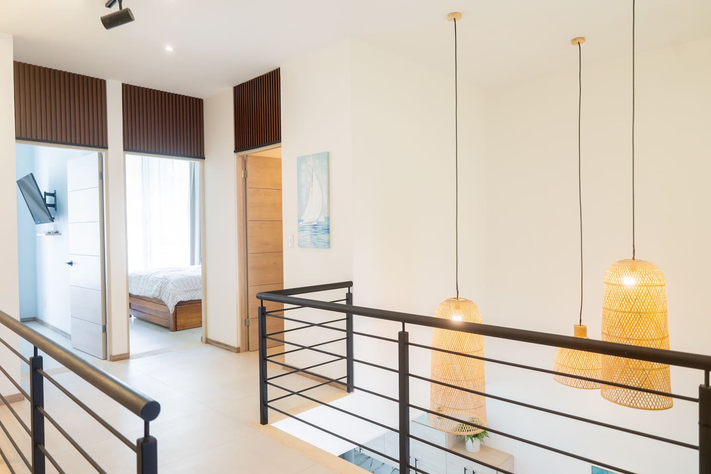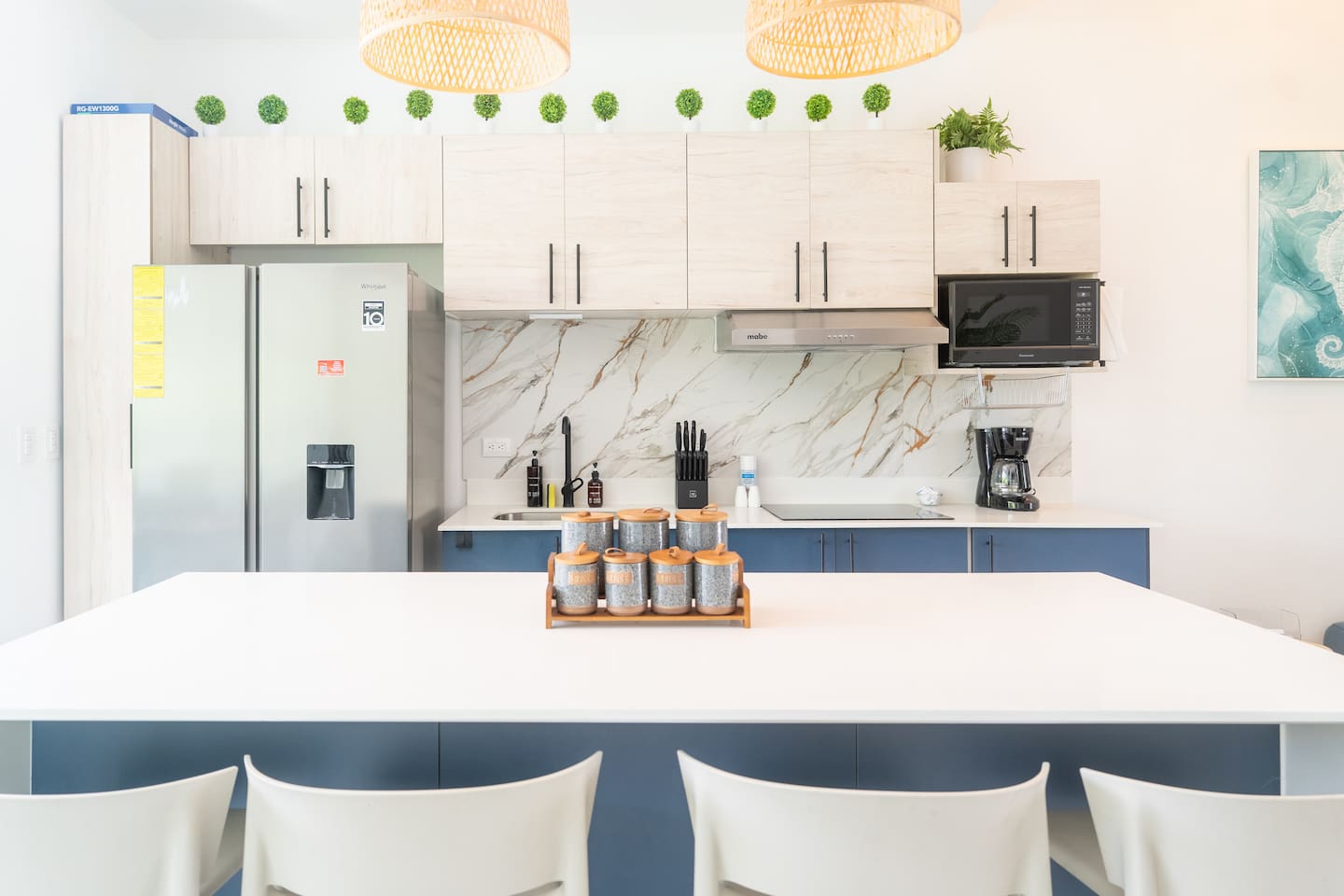 This two-story condo blends contemporary finishes with organic details for a fresh, welcoming feel. • Master bedroom on the second floor with a king bed. • Second bedroom upstairs with a queen bed • Third bedroom upstairs with a queen bed • Bright open-concept living room with comfortable seating • 2.5 bathrooms • Fully equipped modern kitchen with spacious island seating • Private plunge pool with landscaped patio • Thoughtfully designed interiors with natural textures, greenery, and abundant light