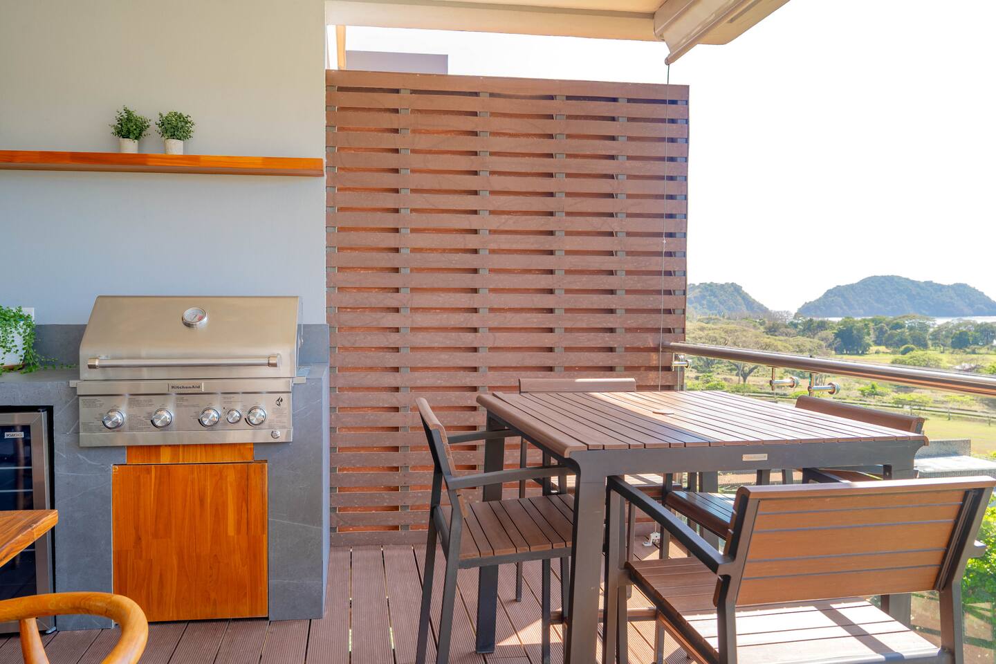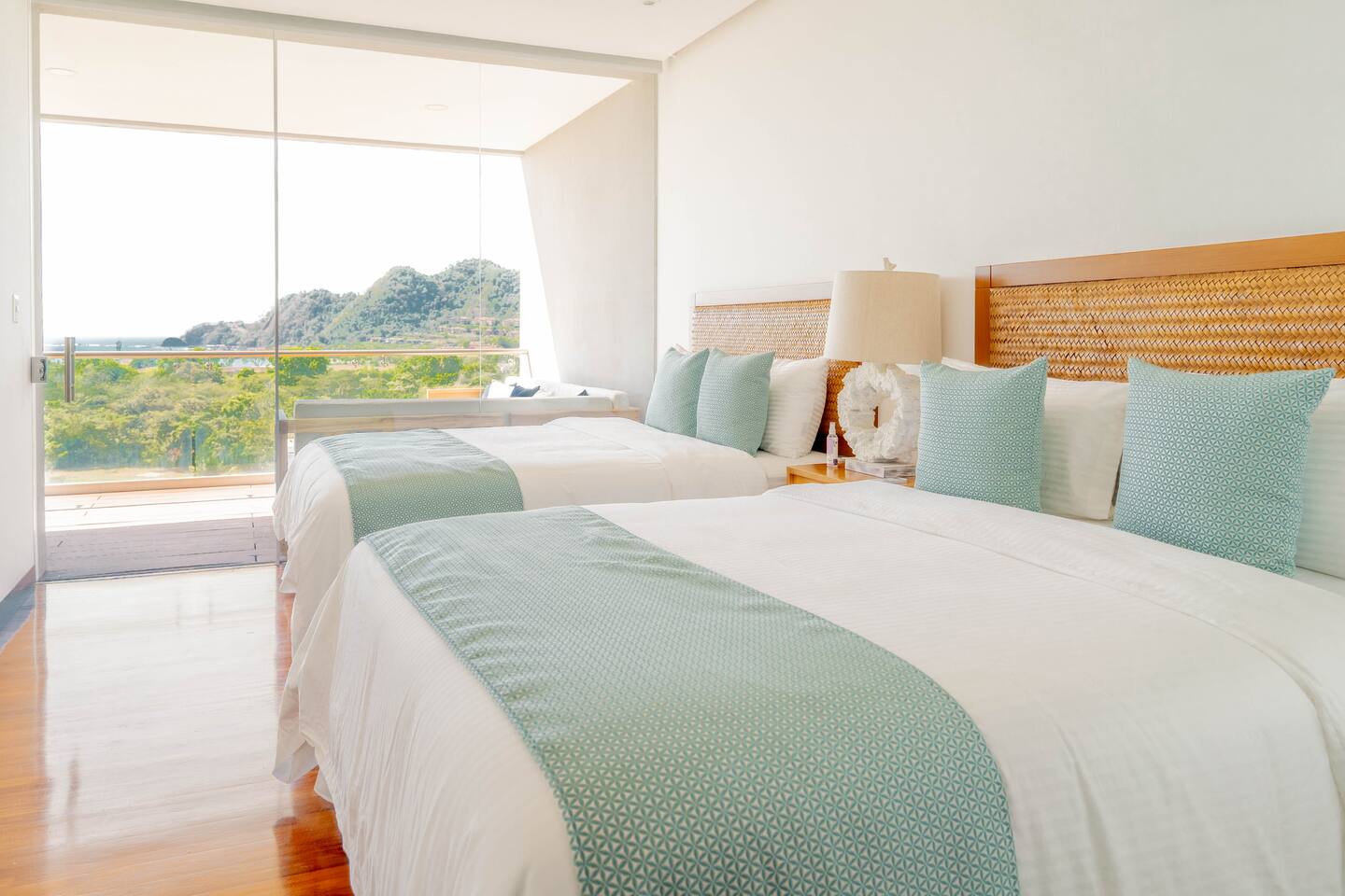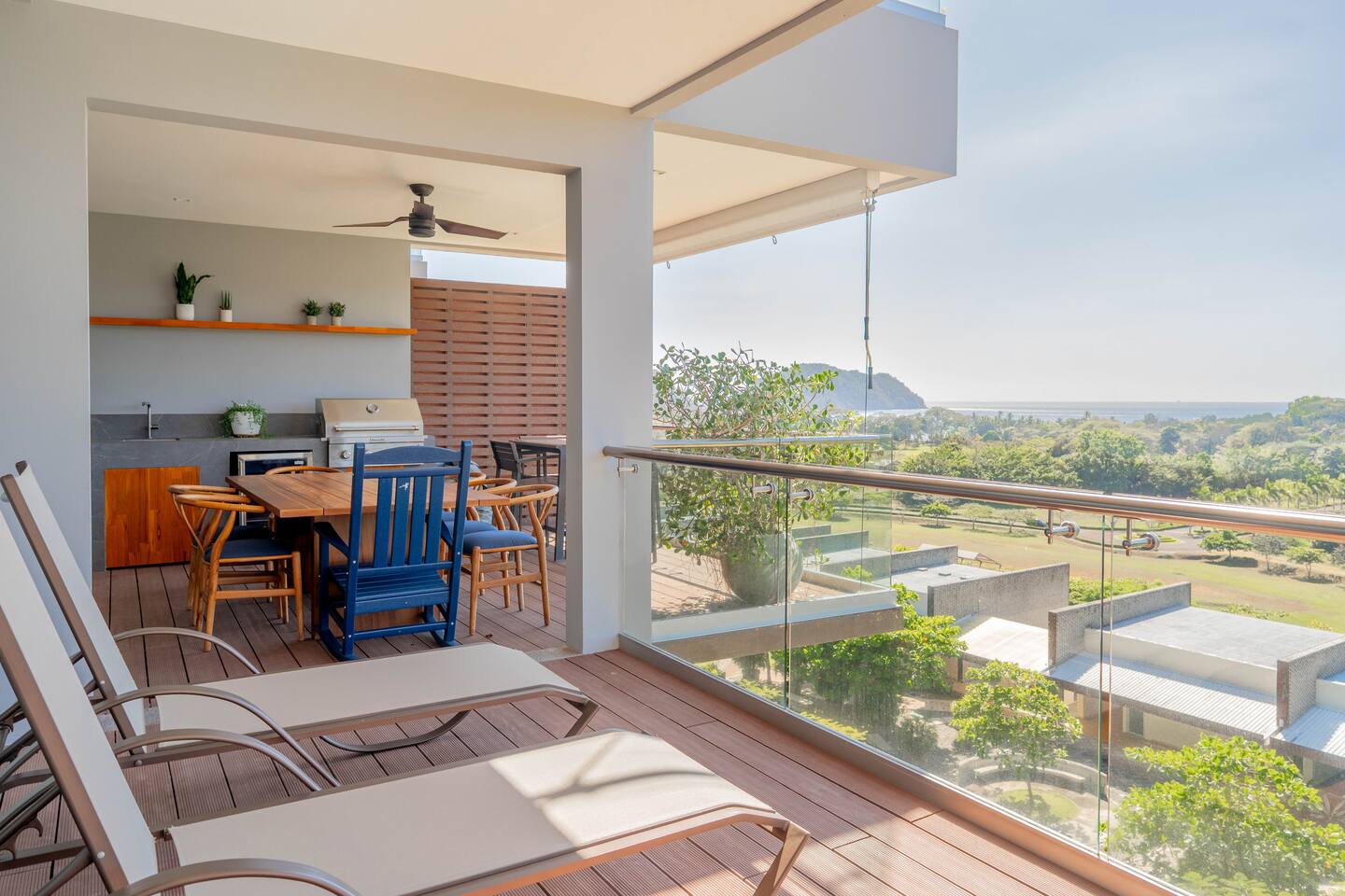 Natural light, clean finishes, and hardwood floors in all the bedrooms give this apartment a calm, comfortable feel. The layout is practical for families, offering plenty of room to gather or unwind. 3 full bedrooms: -Master suite with king bed, ensuite bathroom, private terrace access, and ocean view -Second bedroom with two full beds -Third bedroom with queen bed and garden view nook - 1 additional full bathroom with modern fixtures - Open living and dining area with large windows and direct access to the terrace - Fully equipped kitchen with everything needed to cook or prepare meals at home - Covered terrace with lounge chairs, dining space, and views of Herradura Bay and surrounding greenery